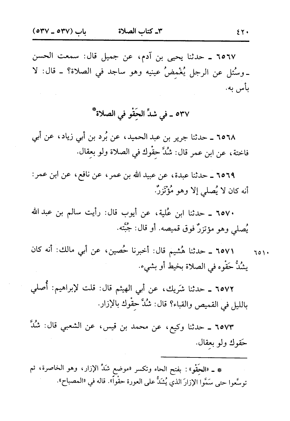 6571- حَدَّثَنَا هُشَيْمٌ , قَالَ : أَخْبَرَنَا حُصَيْنٌ ، عَنْ أَبِي مَالِكٍ ؛ أَنَّهُ كَانَ يَشُدُّ حِقْوَهُ فِي الصَّلاَة بِخَيْطٍ ، أَوْ بِشَيْءٍ.
