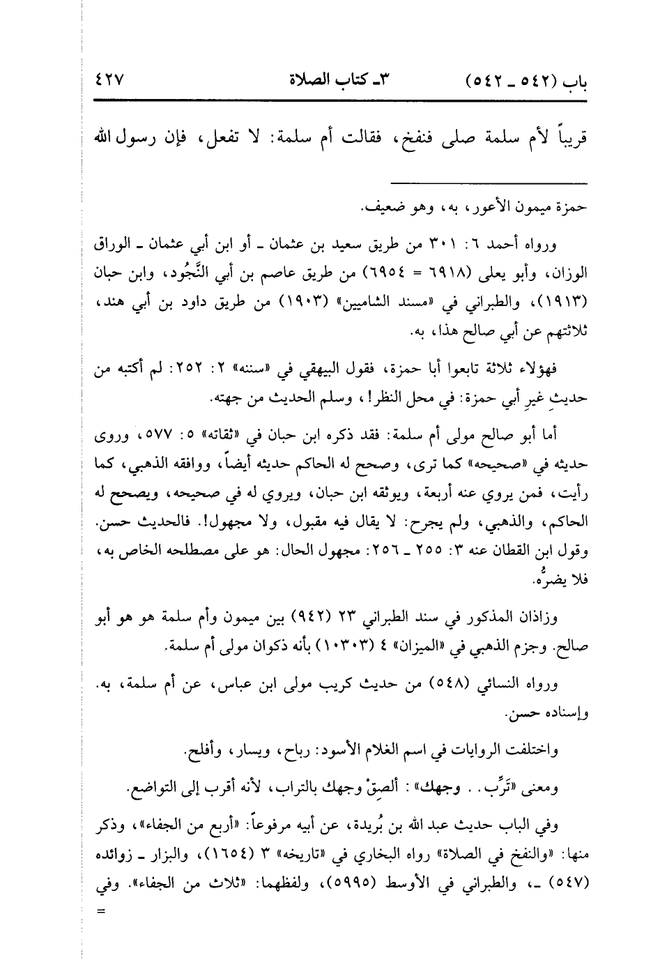 6611- حَدَّثَنَا أَبُو الأَحْوَصِ ، عَنْ أَبِي حَمْزَةَ ، عَنْ أَبِي صَالِحٍ ؛ أَنَّ قَرِيبًا لأُمِّ سَلَمَةَ صَلَّى فَنَفَخَ ، فَقَالَتْ أُمُّ سَلَمَةَ : لاَ تَفْعَلْ ، فَإِنَّ رَسُولَ اللهِ صَلَّى الله عَلَيْهِ وَسَلَّمَ قَالَ لِغُلاَمٍ لَنَا أَسْوَدَ ، يُقَالَ لَهُ : رَبَاحٌ : تَرِّبْ يَا رَبَاحُ وَجْهَك. (2/265).