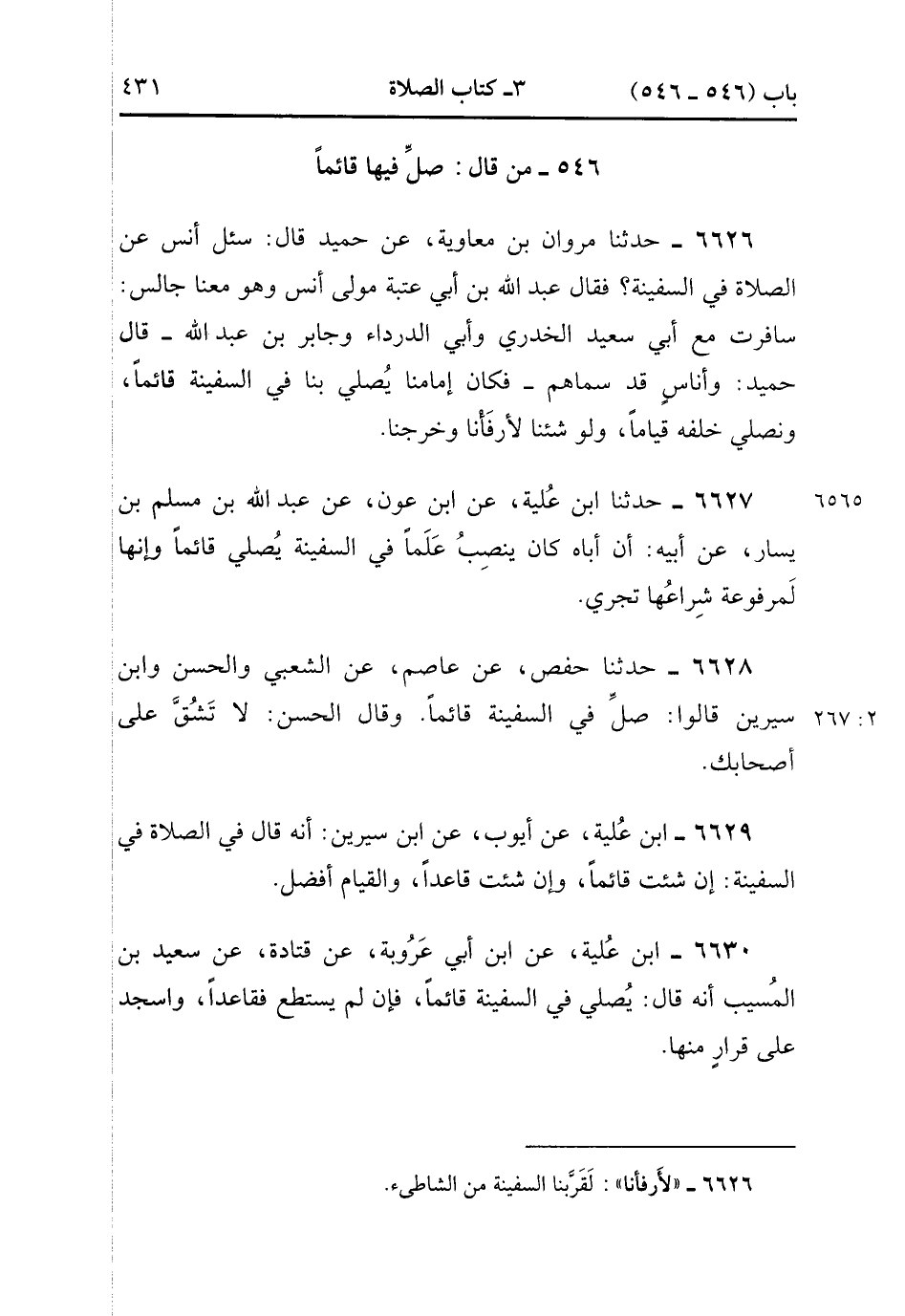 6626- حَدَّثَنَا مَرْوَانُ بْنُ مُعَاوِيَةَ ، عَنْ حُمَيْدٍ ، قَالَ : سُئِلَ أَنَسٌ عَنِ الصَّلاَة فِي السَّفِينَةِ ؟ فَقَالَ عَبْدُ اللهِ بْنُ أَبِي عُتْبَةَ مَوْلَى أَنَسٍ ، وَهُوَ مَعَنَا جَالِسٌ : سَافَرْتُ مَعَ أَبِي سَعِيدٍ الْخُدْرِيِّ ، وَأَبِي الدَّرْدَاءِ ، وَجَابِرِ بْنِ عَبْدِ اللهِ ، قَالَ حُمَيْدُ : وَأُنَاسٍ قَدْ سَمَّاهُمْ ، فَكَانَ إِمَامُنَا يُصَلِّي بِنَا فِي السَّفِينَةِ قَائِمًا ، وَنُصَلِّي خَلْفَهُ قِيَامًا ، وَلَوْ شِئْنَا لأَرْفَأنَا وَخَرَجْنَا.