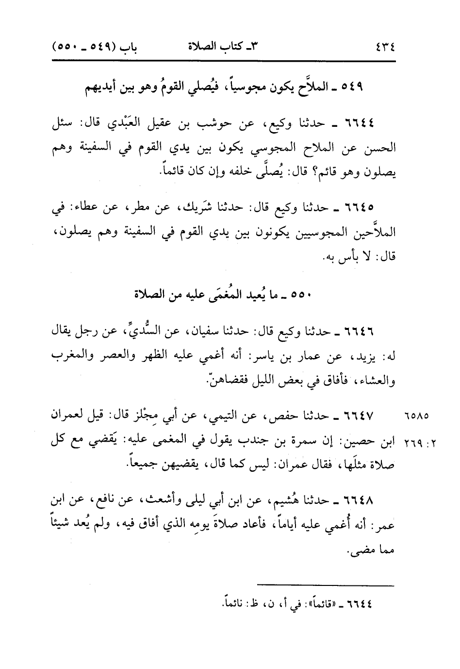 6644- حَدَّثَنَا وَكِيعٌ ، عَنْ حَوْشَبِ بْنِ عَقِيلٍ الْعَبْدِيِّ ، قَالَ : سُئِلَ الْحَسَنُ عَنِ الْمَلاَّحِ الْمَجُوسِيِّ يَكُونُ بَيْنَ يَدَيَ الْقَوْمِ فِي السَّفِينَةِ وَهُمْ يُصَلُّونَ ، وَهُوَ قَائِمٌ ؟ قَالَ : يُصَلَّى خَلْفَهُ ، وَإِنْ كَانَ قَائِمًا.