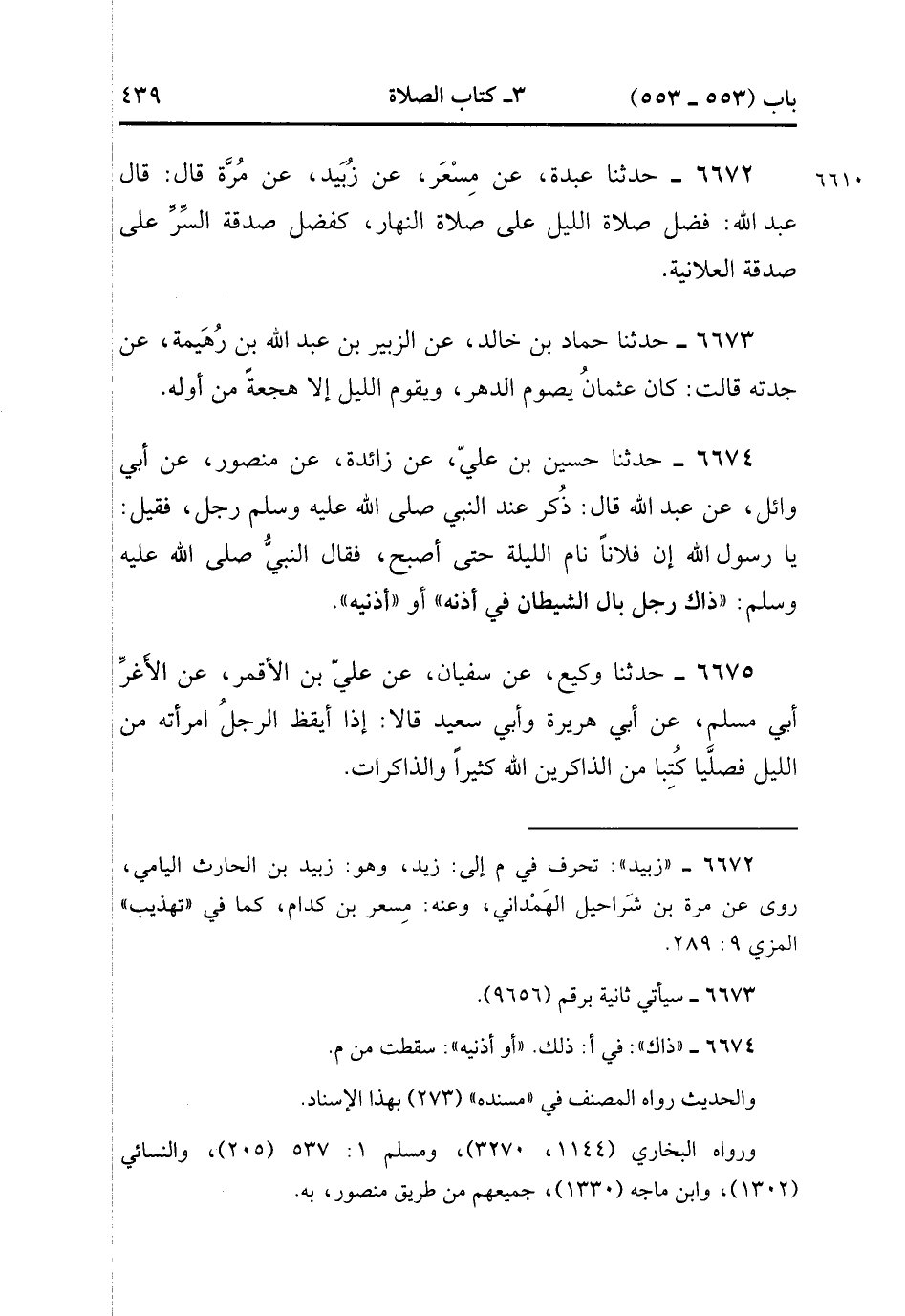 6674- حَدَّثَنَا حُسَيْنُ بْنُ عَلِيٍّ ، عَنْ زَائِدَةَ ، عَنْ مَنْصُورٍ ، عَنْ أَبِي وَائِلٍ ، عَنْ عَبْدِ اللهِ ، قَالَ : ذُكِرَ عِنْدَ النَّبِيِّ صَلَّى الله عَلَيْهِ وَسَلَّمَ رَجُلٌ ، فَقِيلَ : يَا رَسُولَ اللهِ ، إِنَّ فُلاَنًا نَامَ اللَّيْلَ حَتَّى أَصْبَحَ ، فَقَالَ النَّبِيُّ صَلَّى الله عَلَيْهِ وَسَلَّمَ : ذَاكَ رَجُلٌ بَالَ الشَّيْطَانُ فِي أُذُنِهِ ، أَوْ أُذُنَيْهِ.