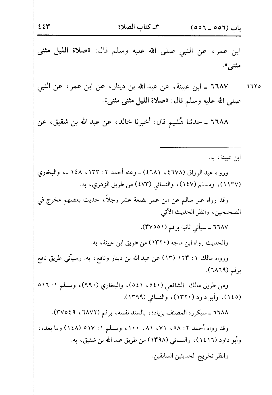 6688- حَدَّثَنَا هُشَيْمٌ , قَالَ : أَخْبَرَنَا خَالِدٌ ، عَنْ عَبْدِ اللهِ بْنِ شَقِيقٍ ، عَنِ ابْنِ عُمَرَ ، أَنَّ النَّبِيَّ صَلَّى الله عَلَيْهِ وَسَلَّمَ ، قَالَ : صَلاَةُ اللَّيْلِ مَثْنَى مَثْنَى. (2/273).