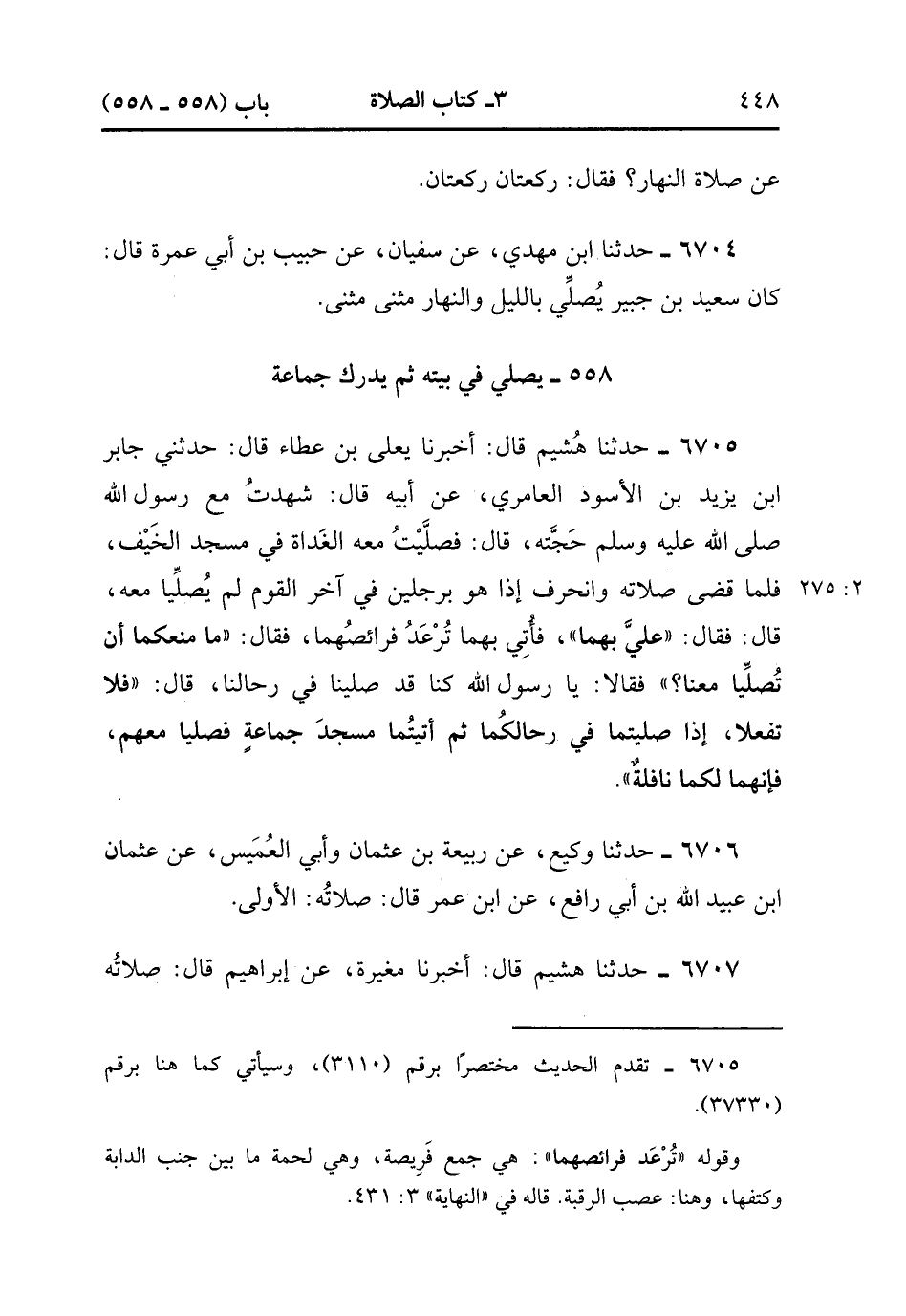 6705- حَدَّثَنَا هُشَيْمٌ , قَالَ : أَخْبَرَنَا يَعْلَى بْنُ عَطَاءٍ ، قَالَ : حَدَّثَنِي جَابِرُ بْنُ يَزِيدَ بْنِ الأَسْوَدِ الْعَامِرِيُّ ، عَنْ أَبِيهِ ، قَالَ : شَهِدْتُ مَعَ رَسُولِ اللهِ صَلَّى الله عَلَيْهِ وَسَلَّمَ حَجَّتَهُ ، قَالَ : فَصَلَّيْتُ مَعَهُ الْغَدَاةَ فِي مَسْجِدِ الْخَيْفِ ، فَلَمَّا قَضَى صَلاَتَهُ وَانْحَرَفَ ، إِذَا هُوَ بِرَجُلَيْنِ فِي آخِرِ الْقَوْمِ لَمْ يُصَلِّيَا مَعَهُ ، قَالَ : فَقَالَ : عَلَيَّ بِهِمَا ، فَأُتِيَ بِهِمَا تَرْعَدُ فَرَائِصُهُمَا ، فَقَالَ : مَا مَنَعَكُمَا أَنْ تُصَلِّيَا مَعَنَا ؟ فَقَالاَ : يَا رَسُولَ اللهِ ، كُنَّا قَدْ صَلَّيْنَا فِي رِحَالِنَا ، قَالَ : فَلاَ تَفْعَلاَ ، إِذَا صَلَّيْتُمَا فِي رِحَالِكُمَا ثُمَّ أَتَيْتُمَا مَسْجِدَ جَمَاعَةٍ فَصَلِّيَا مَعَهُمْ ، فَإِنَّهُمَا لَكُمَا نَافِلَةٌ. (2/274).