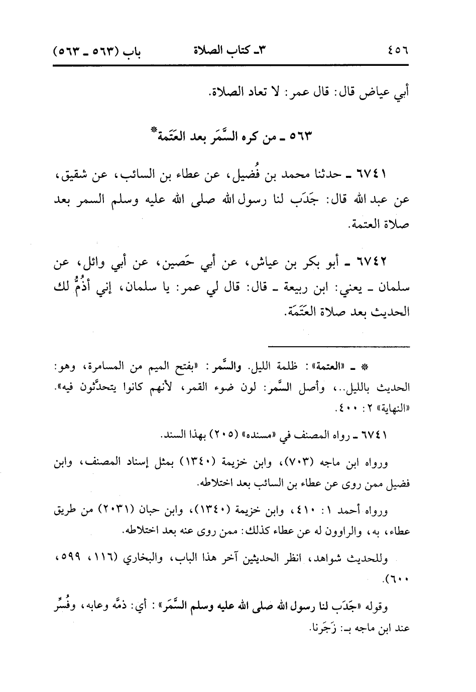 6742- حَدَّثَنَا أَبُو بَكْرِ بْنُ عَيَّاشٍ ، عَنْ أَبِي حَصِينٍ ، عَنْ أَبِي وَائِلٍ ، عَنْ سَلْمَانَ ، يَعْنِي ابْنَ رَبِيعَةَ ، قَالَ : قَالَ لِي عُمَرُ : يَا سَلْمَانُ ، إِنِّي أَذُمُّ لَكَ الْحَدِيثَ بَعْدَ صَلاَةِ الْعَتَمَةِ. (2/279).
