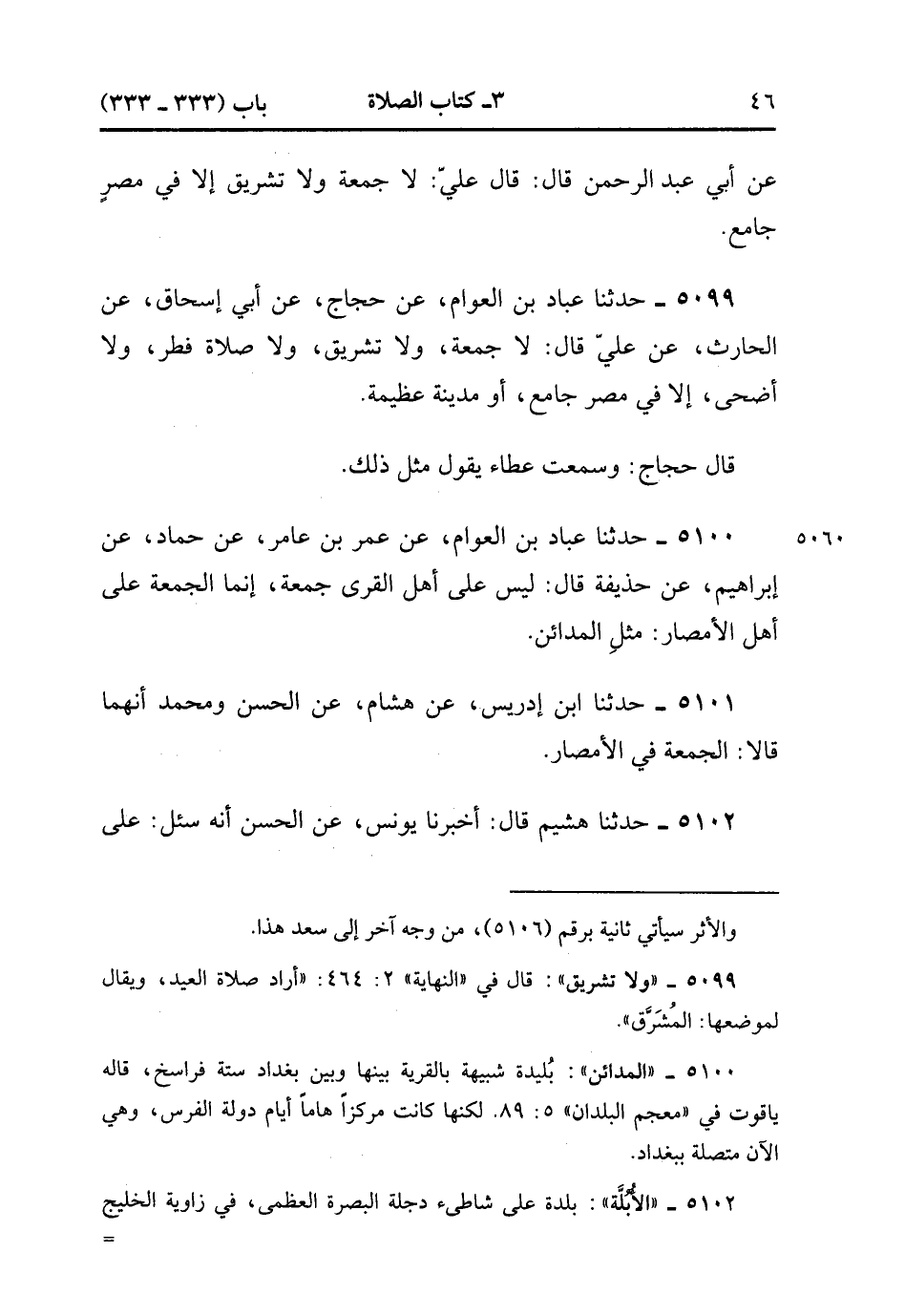 5102- حَدَّثَنَا هُشَيْمٌ , قَالَ : أَخْبَرَنَا يُونُسُ ، عَنِ الْحَسَنِ ؛ أَنَّهُ سُئِلَ : عَلَى أَهْلِ الأُبُلَّة جُمُعَةٌ ؟ قَالَ : لاَ. (2/101).