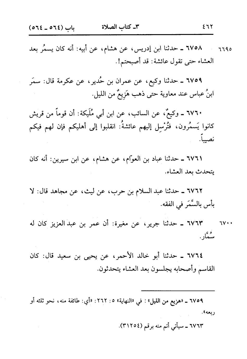 6764- حَدَّثَنَا أَبُو خَالِدٍ الأَحْمَرِِ ، عَنْ يَحْيَى بْنِ سَعِيدٍ ، قَالَ : كَانَ الْقَاسِمُ وَأَصْحَابُهُ يَجْلِسُونَ بَعْدَ الْعِشَاءِ يَتَحَدَّثُونَ. (2/281).