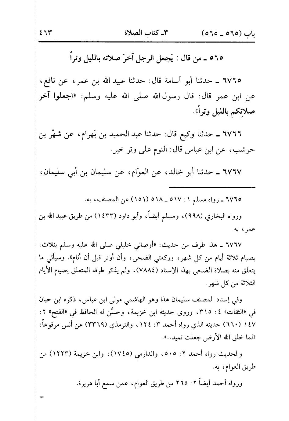 6767- حَدَّثَنَا أَبُو خَالِدٍ ، عَنِ الْعَوَّامِ ، عَنْ سُلَيْمَانَ بْنِ أَبِي سُلَيْمَانَ ، عَنْ أَبِي هُرَيْرَةَ ، قَالَ : أَوْصَانِي خَلِيلِي صَلَّى الله عَلَيْهِ وَسَلَّمَ : أَنْ لاَ أَنَامَ إِلاَّ عَلَى وَتْرٍ. (2/281).