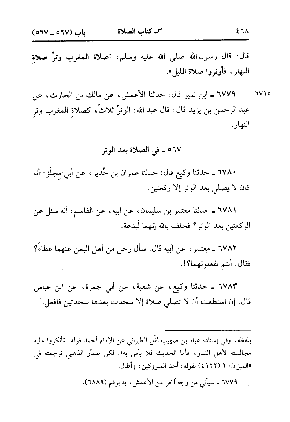 6779- حَدَّثَنَا ابْنُ نُمَيْرٍ , قَالَ : حدَّثَنَا الأَعْمَشُ ، عَنْ مَالِكِ بْنِ الْحَارِثِ ، عَنْ عَبْدِ الرَّحْمَنِ بْنِ يَزِيدَ ، قَالَ : قَالَ عَبْدُ اللهِ : الْوِتْرُ ثَلاَثٌ ، كَصَلاَةِ الْمَغْرِبِ وِتْرُ النَّهَارِ.