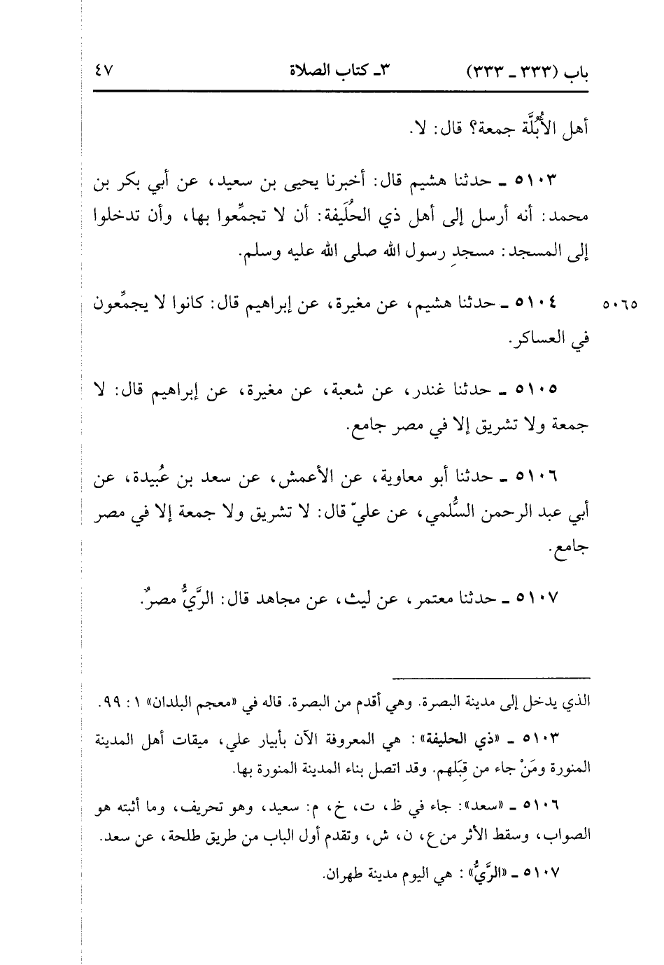 5105 - حَدَّثَنَا غُنْدَرٌ ، عَنْ شُعْبَةَ ، عَنْ مُغِيرَةَ ، عَنْ إِبْرَاهِيمَ ، قَالَ : لاَ جُمُعَةَ ، وَلاَ تَشْرِيقَ إِلاَّ فِي مِصْرٍ جَامِعٍ.