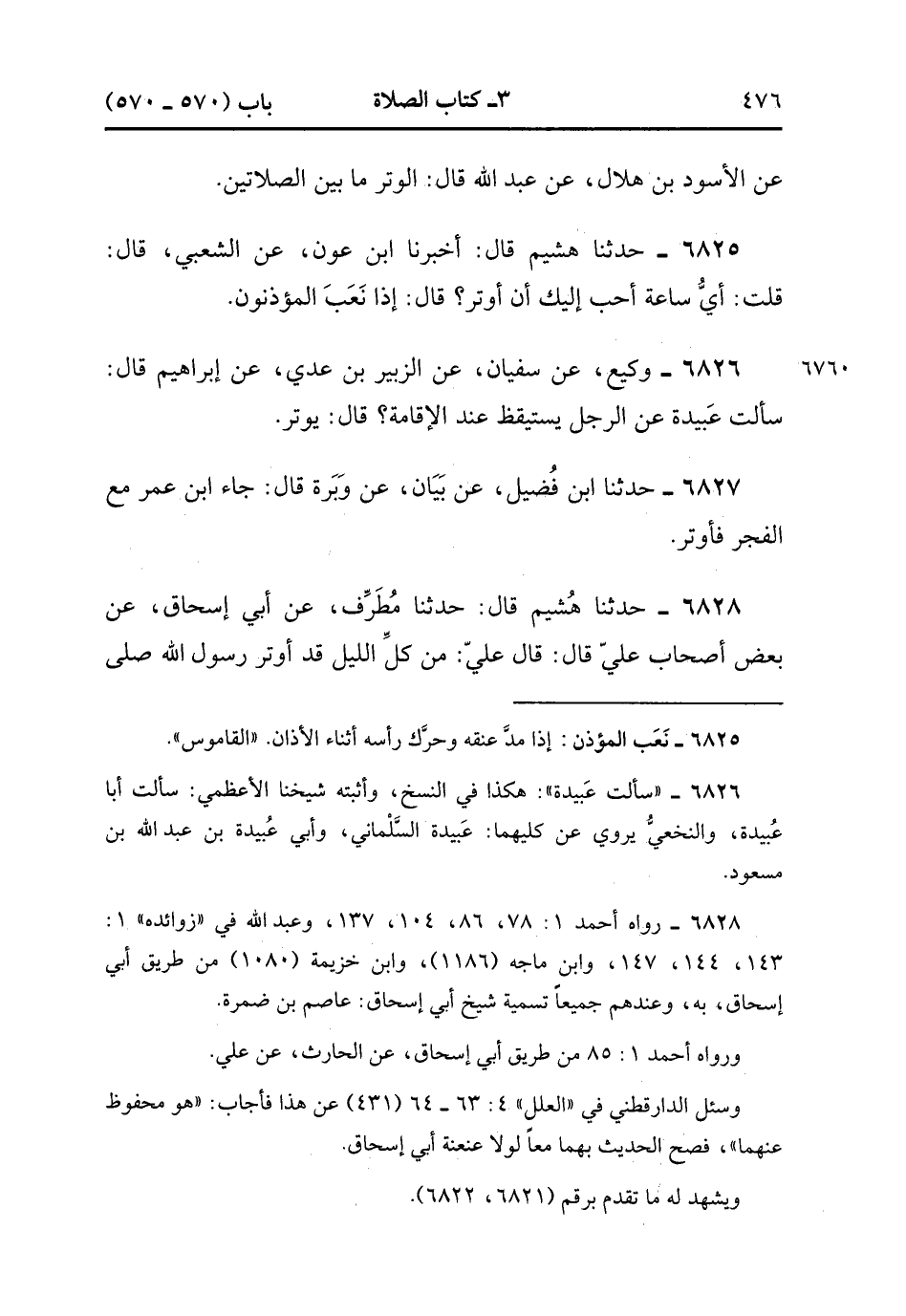 6828- حَدَّثَنَا هُشَيْمٌ , قَالَ : أَخْبَرَنَا مُطَرِّفٌ ، عَنْ أَبِي إِسْحَاقَ ، عَنْ بَعْضِ أَصْحَابِ عَلِيٍّ ، قَالَ : قَالَ عَلِيٌّ : مِنْ كُلِّ اللَّيْلِ قَدْ أَوْتَرَ رَسُولُ اللهِ صَلَّى الله عَلَيْهِ وَسَلَّمَ ؛ مِنْ أَوَّلِهِ ، وَأَوْسَطِهِ ، وَآخِرِهِ ، وَلَكِنْ ثَبَتَ الْوِتْرُ لِرَسُولِ اللهِ صَلَّى الله عَلَيْهِ وَسَلَّمَ مِنْ آخِرِ اللَّيْلِ. (2/287).