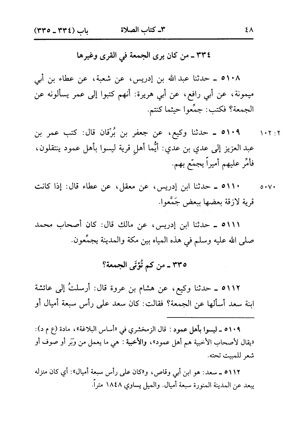5112- حَدَّثَنَا وَكِيعٌ ، عَنْ هِشَامِ بْنِ عُرْوَةَ ، قَالَ : أَرْسَلْتُ إِلَى عَائِشَةَ ابْنَةِ سَعْدٍ ، أَسْأَلُهَا عَنِ الْجُمُعَةِ ؟ فَقَالَتْ : كَانَ سَعْدٌ عَلَى رَأْسِ سَبْعَةِ أَمْيَالٍ ، أَوْ ثَمَانِيَةٍ ، فَكَانَ أَحْيَانَا يَأْتِيهَا ، وَأَحْيَانَا لاَ يَأْتِيهَا. (2/102).