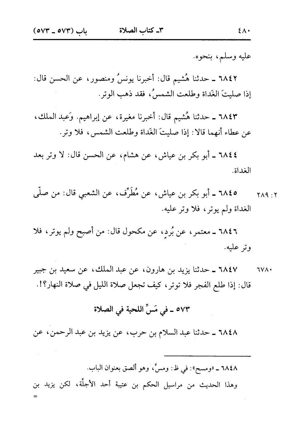 6843- حَدَّثَنَا هُشَيْمٌ , قَالَ : أَخْبَرَنَا مُغِيرَةُ ، عَنْ إِبْرَاهِيمَ (ح) وَعَبْدُ الْمَلِكِ ، عَنْ عَطَاءٍ ؛ أَنَّهُمَا قَالاَ : إِذَا صَلَّيْتَ الْغَدَاةَ وَطَلَعَتِ الشَّمْسُ فَلاَ وَتْرَ. (2/288)
