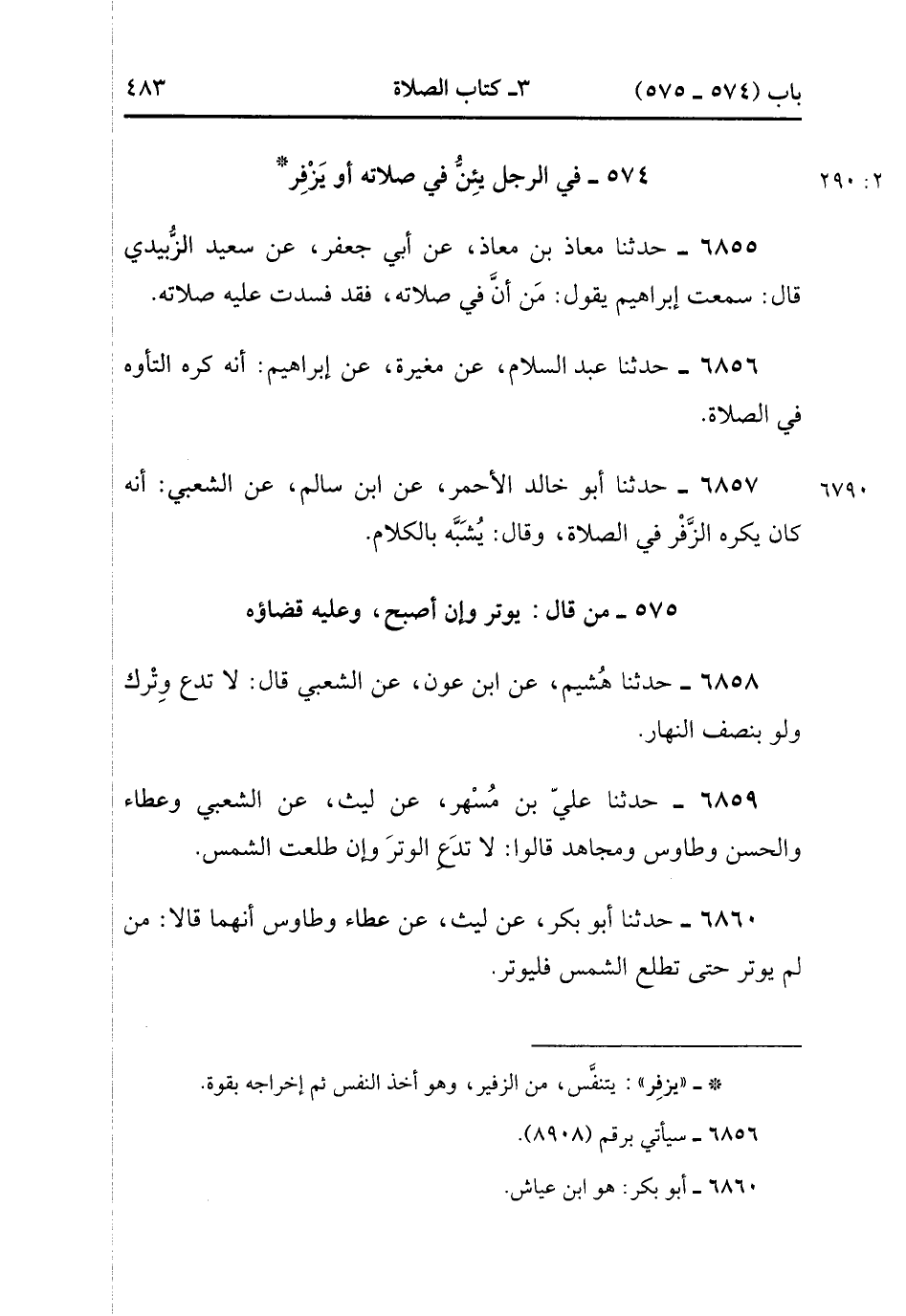 6857- حَدَّثَنَا أَبُو خَالِدٍ الأَحْمَرِِ ، عَنِ ابْنِ سَالِمٍ ، عَنِ الشَّعْبِيِّ ؛ أَنَّهُ كَانَ يَكْرَهُ الزَّفِرَ فِي الصَّلاَة ، وَقَالَ : يُشَبَّهُ بِالْكَلاَمِ.