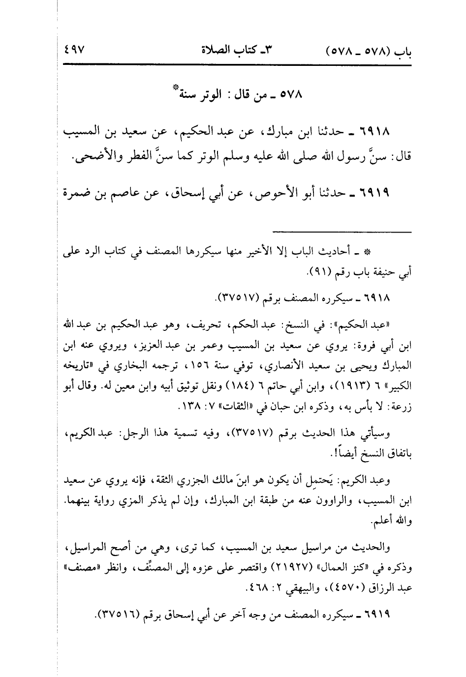 6918- حَدَّثَنَا ابْنُ مُبَارَكٍ ، عَنْ عَبْدِ الْحَكِيمِ ، عَنْ سَعِيدِ بْنِ الْمُسَيَّبِ ، قَالَ : سَنَّ رَسُولُ اللهِ صَلَّى الله عَلَيْهِ وَسَلَّمَ الْوِتْرَ كَمَا سَنَّ الْفِطْرَ وَالأَضْحَى.