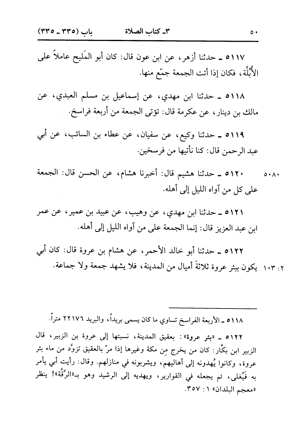 5122- حَدَّثَنَا أَبُو خَالِدٍ الأَحْمَرِِ ، عَنْ هِشَامِ بْنِ عُرْوَةَ ، قَالَ : كَانَ أَبِي يَكُونُ بِبِئْرِ عُرْوَةَ ثَلاَثَةِ أَمْيَالٍ مِنَ الْمَدِينَةِ ، فَلاَ يَشْهَدُ جُمُعَةً ، وَلاَ جَمَاعَةً. (2/102).