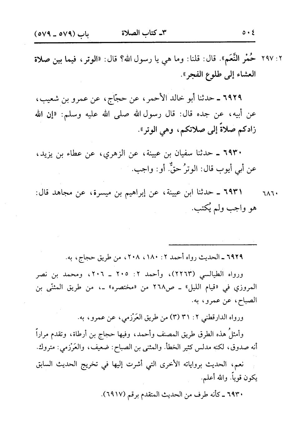 6929- حَدَّثَنَا أَبُو خَالِدٍ الأَحْمَرِِ ، عَنْ حَجَّاجٍ ، عَنْ عَمْرِو بْنِ شُعَيْبٍ ، عَنْ أَبِيهِ ، عَنْ جَدِّهِ ، قَالَ : قَالَ رَسُولُ اللهِ صَلَّى الله عَلَيْهِ وَسَلَّمَ : إِنَّ اللَّهَ زَادَكُمْ صَلاَةً إِلَى صَلاَتِكُمْ ، وَهِيَ الْوِتْرُ.