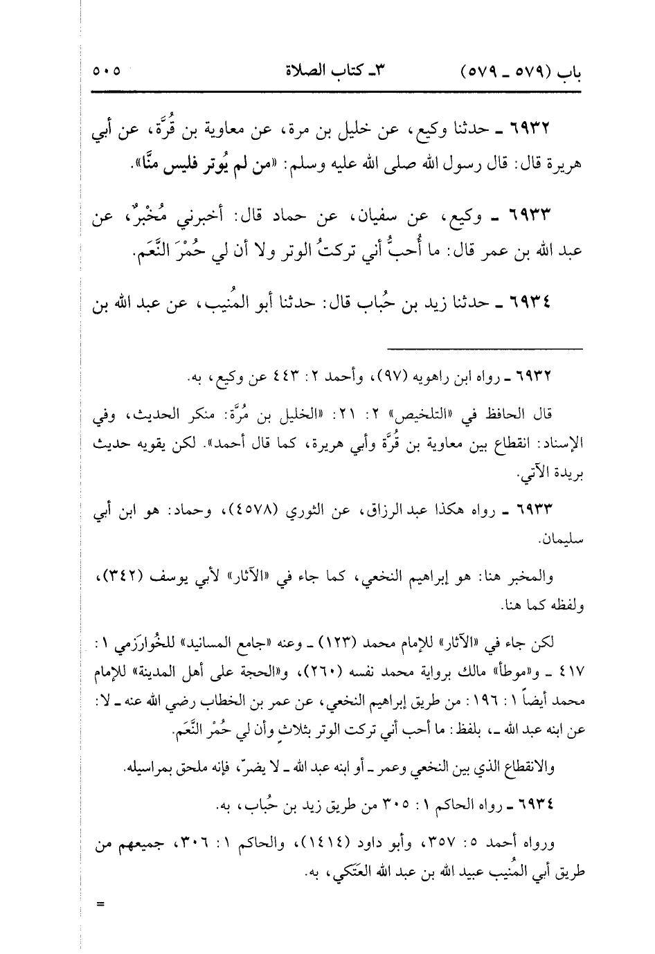 6934- حَدَّثَنَا زَيْدُ بْنُ حُبَابٍ , قَالَ : حدَّثَنَا أَبُو الْمُنِيبِ ، عَنْ عَبْدِ اللهِ بْنِ بُرَيْدَةَ ، عَنْ أَبِيهِ ، قَالَ : قَالَ رَسُولُ اللهِ صَلَّى الله عَلَيْهِ وَسَلَّمَ : الْوِتْرُ حَقٌّ ، فَمَنْ لَمْ يُوتِرْ فَلَيْسَ مِنَّا. (2/297).