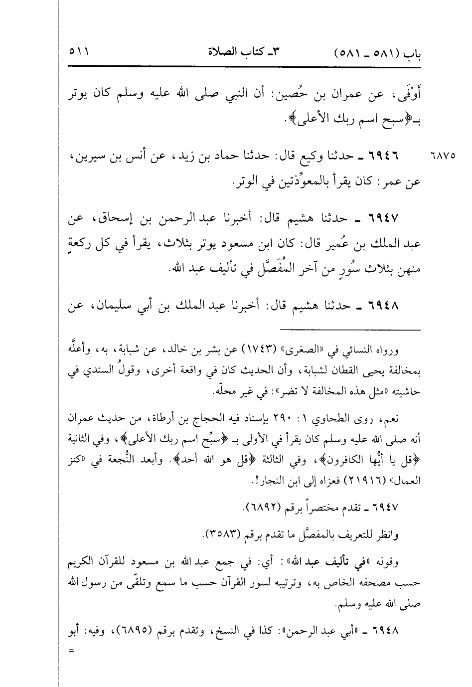 6947- حَدَّثَنَا هُشَيْمٌ , قَالَ : أَخْبَرَنَا عَبْدُ الرَّحْمَنِ بْنُ إِسْحَاقَ ، عَنْ عَبْدِ الْمَلِكِ بْنِ عُمَيْرٍ ، قَالَ : كَانَ ابْنُ مَسْعُودٍ يُوتِرُ بِثَلاَثٍ ، يَقْرَأُ فِي كُلِّ رَكْعَةٍ مِنْهُنَّ بِثَلاَثِ سُوَرٍ ، مِنْ آخِرِ الْمُفَصَّلِ ، مِنْ تَأْلِيفِ عَبْدِ اللهِ.