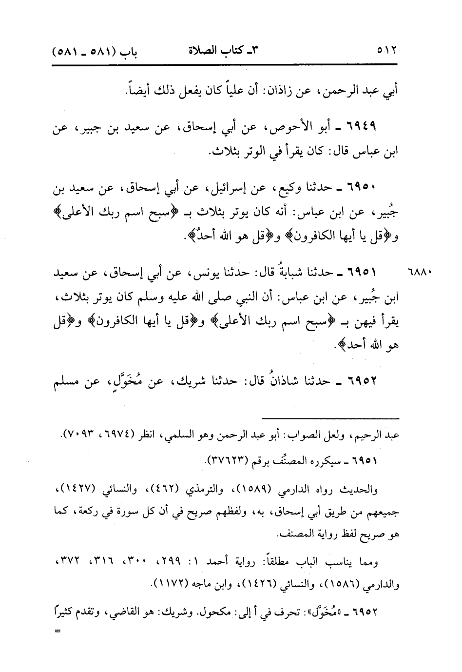 6949- حَدَّثَنَا أَبُو الأَحْوَصِ ، عَنْ أَبِي إِسْحَاقَ ، عَنْ سَعِيدِ بْنِ جُبَيْرٍ ، عَنِ ابْنِ عَبَّاسٍ ، قَالَ : كَانَ يَقْرَأُ فِي الْوِتْرِ بِثَلاَثٍ.