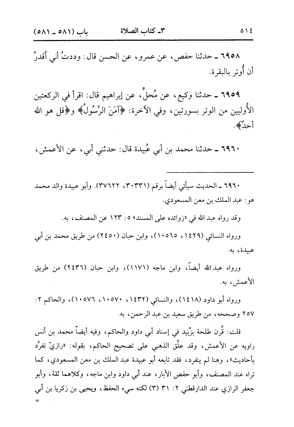 6959- حَدَّثَنَا وَكِيعٌ ، عَنْ مُحِلٍّ ، عَنْ إِبْرَاهِيمَ ، قَالَ : اِقْرَأْ فِي الرَّكْعَتَيْنِ الأُولَيَيْنِ مِنَ الْوِتْرِ بِسُورَتَيْنِ ، وَفِي الآخِرَةِ : {آمَنَ الرَّسُولُ} ، وَ{قُلْ هُوَ اللَّهُ أَحَدٌ}. (2/300).