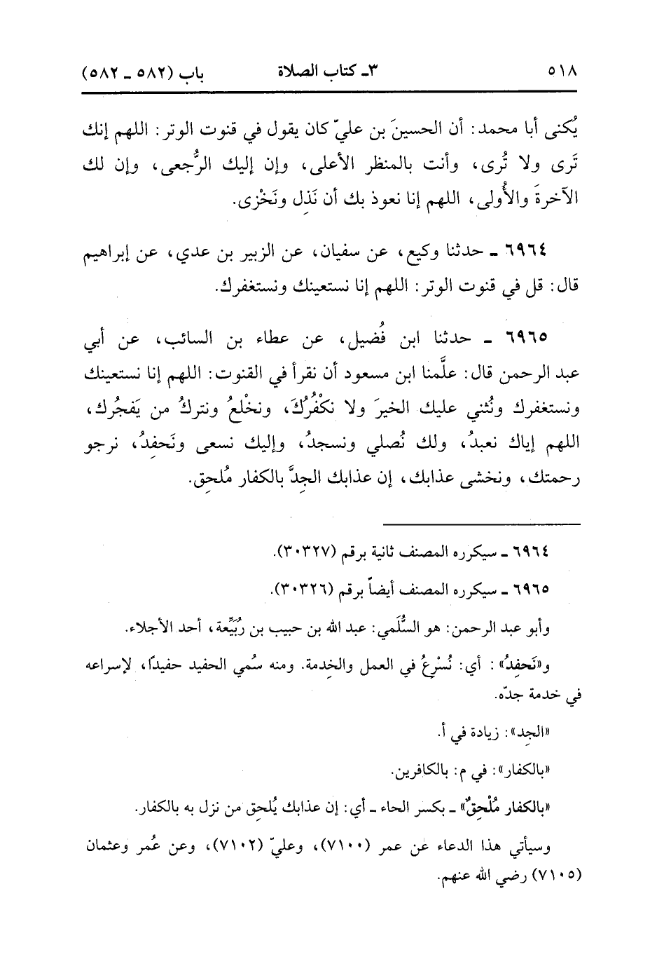 6965- حَدَّثَنَا ابْنُ فُضَيْلٍ ، عَنْ عَطَاءِ بْنِ السَّائِبِ ، عَنْ أَبِي عَبْدِ الرَّحْمَنِ ، قَالَ : عَلَّمَنَا ابْنُ مَسْعُودٍ أَنْ نَقْرَأَ فِي الْقُنُوتِ : اللَّهُمَّ إِنَّا نَسْتَعِينُكَ وَنَسْتَغْفِرُكَ ، وَنُثْنِي عَلَيْكَ الْخَيْرَ ، وَلاَ نَكْفُرُكَ ، وَنَخْلَعُ وَنَتْرُكُ مَنْ يَفْجُرُكَ ، اللَّهُمَّ إِيَّاكَ نَعْبُدُ ، وَلَكَ نُصَلِّي وَنَسْجُدُ ، وَإِلَيْكَ نَسْعَى وَنَحْفِدُ ، نَرْجُو رَحْمَتَكَ وَنَخْشَى عَذَابَكَ ، إِنَّ عَذَابَكَ الْجِدَّ بِالْكُفَّارِ مُلْحِقٌ. (2/301).