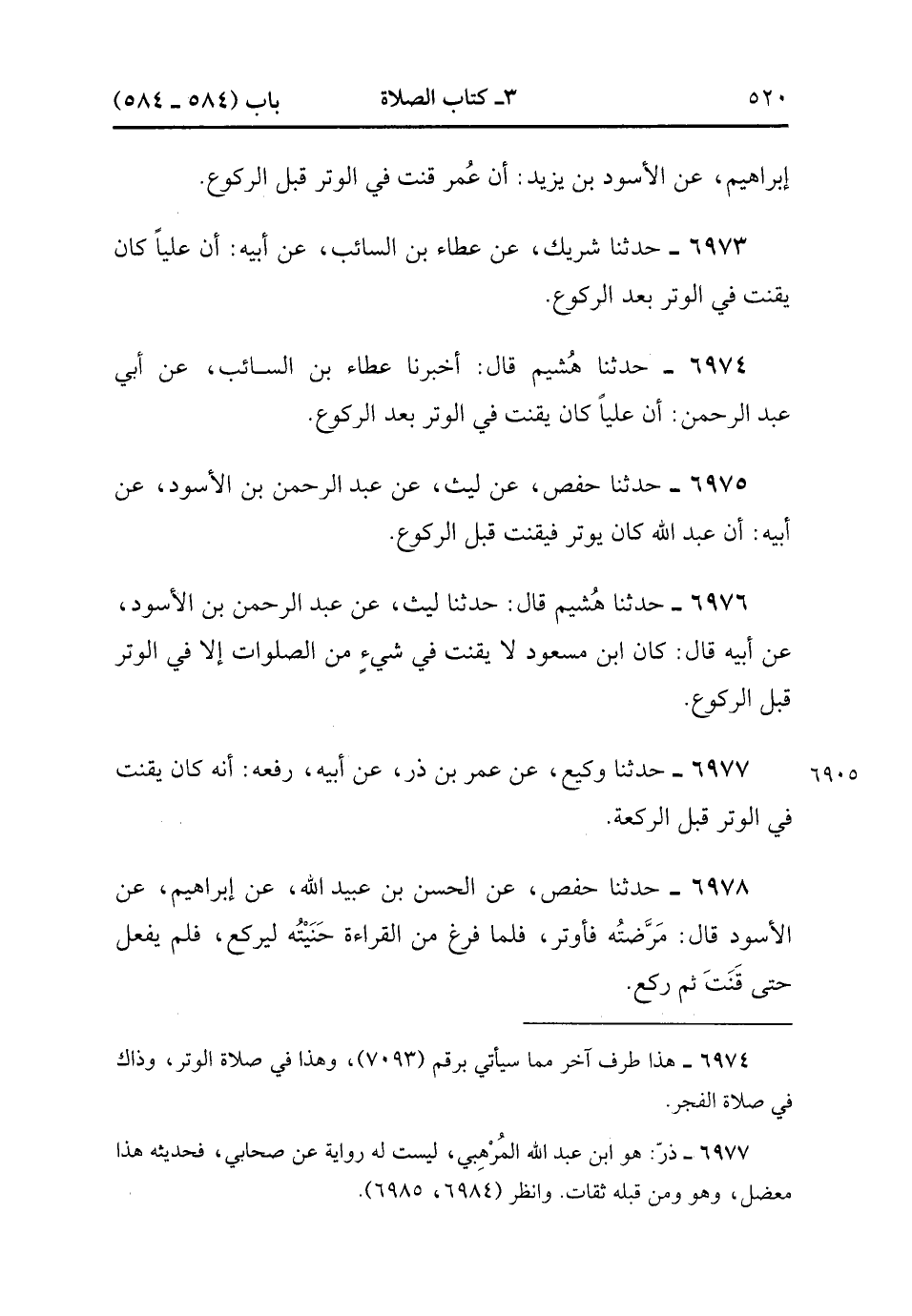 6974- حَدَّثَنَا هُشَيْمٌ , قَالَ : أَخْبَرَنَا عَطَاءُ بْنُ السَّائِبِ ، عَنْ أَبِي عَبْدِ الرَّحْمَنِ ؛ أَنَّ عَلِيًّا كَانَ يَقْنُتُ فِي الْوِتْرِ بَعْدَ الرُّكُوعِ.