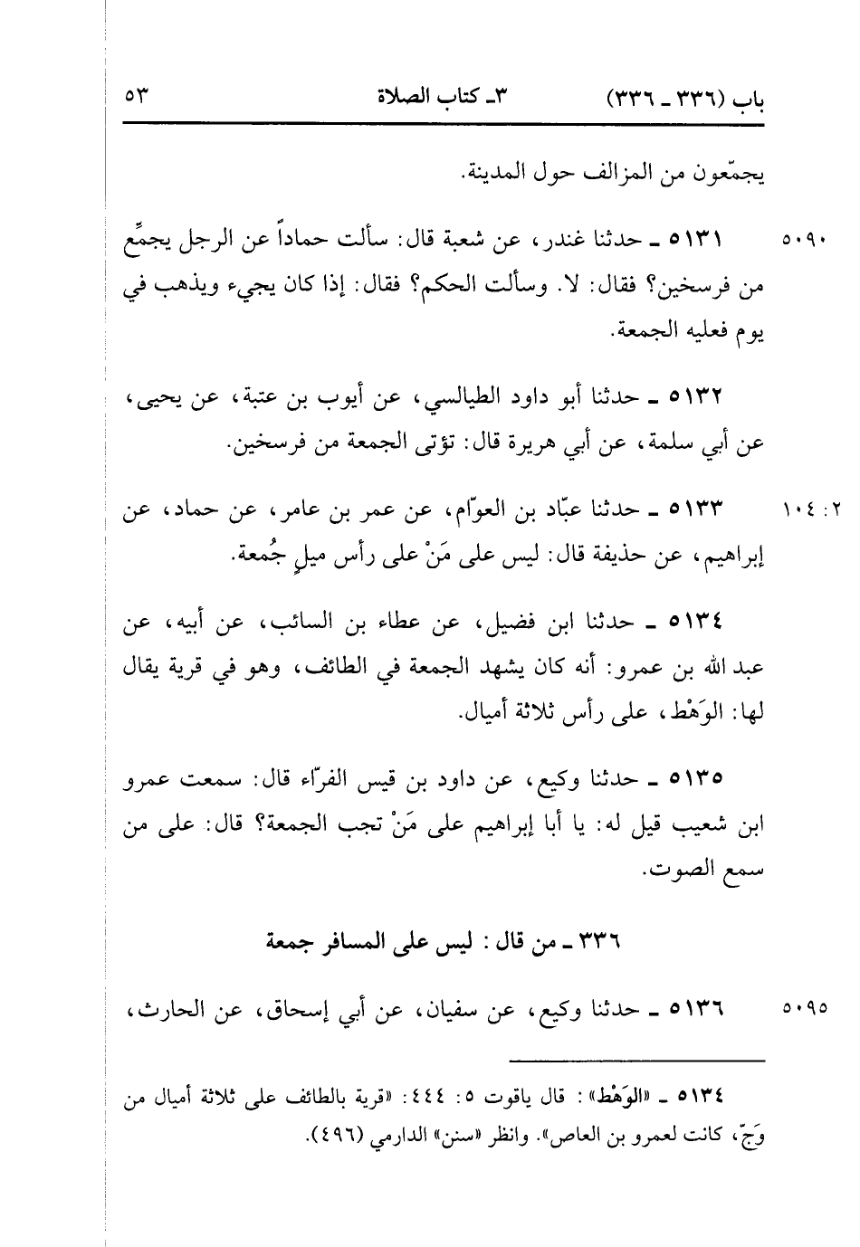 5134- حَدَّثَنَا ابْنُ فُضَيْلٍ ، عَنْ عَطَاءِ بْنِ السَّائِبِ ، عَنْ أَبِيهِ ، عَنْ عَبْدِ اللهِ بْنِ عَمْرٍو ؛ أَنَّهُ كَانَ يَشْهَدُ الْجُمُعَةَ فِي الطَّائِفِ وَهُوَ فِي قَرْيَةٍ ، يُقَالَ لَهَا : الْوَهْطُ ، عَلَى رَأْسِ ثَلاَثَةِ أَمْيَالٍ.