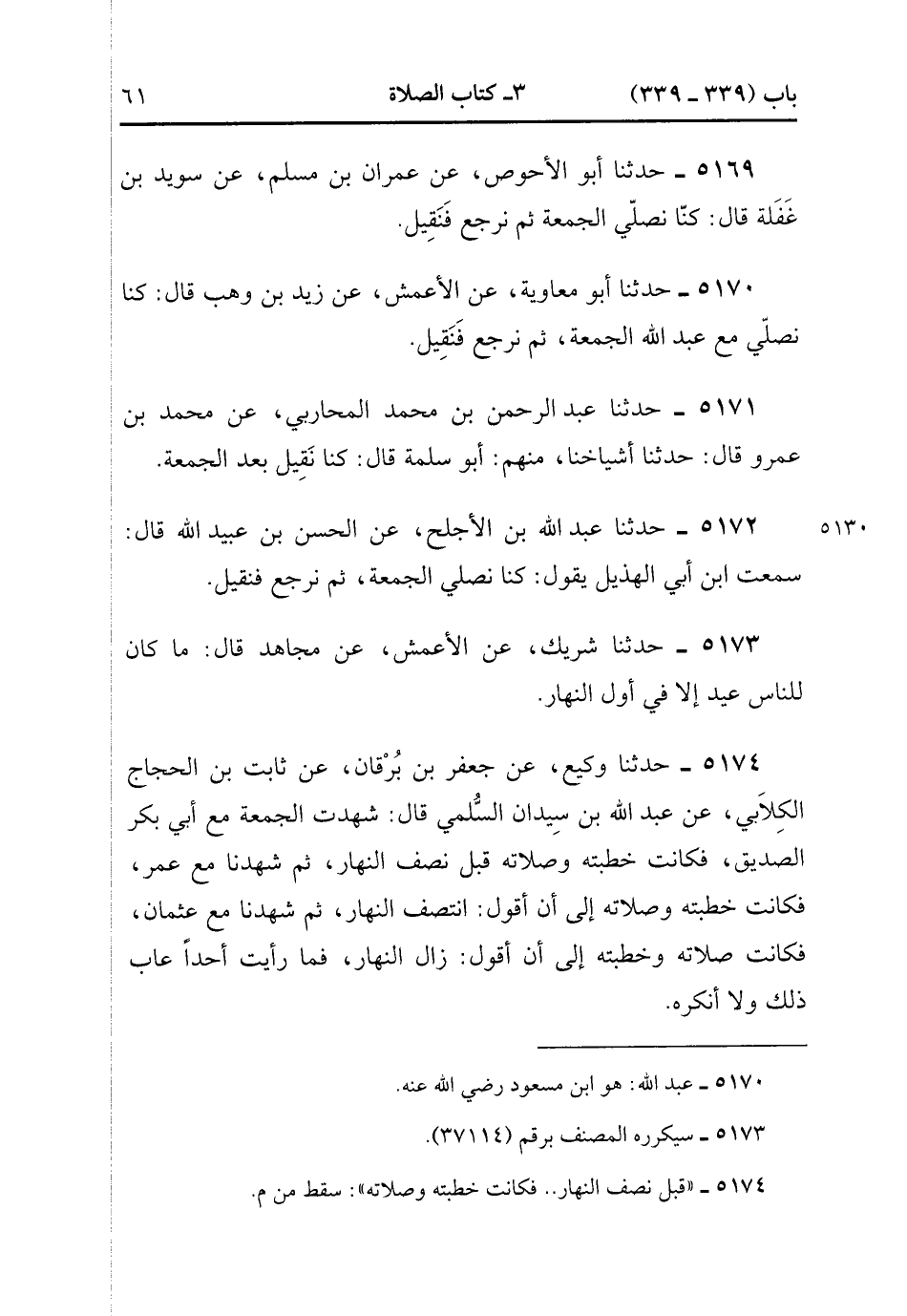 5170- حَدَّثَنَا أَبُو مُعَاوِيَةَ ، عَنِ الأَعْمَشِ ، عَنْ زَيْدِ بْنِ وَهْبٍ ، قَالَ : كُنَّا نُصَلِّي مَعَ عَبْدِ اللهِ الْجُمُعَةَ ، ثُمَّ نَرْجِعُ فَنَقِيلُ.
