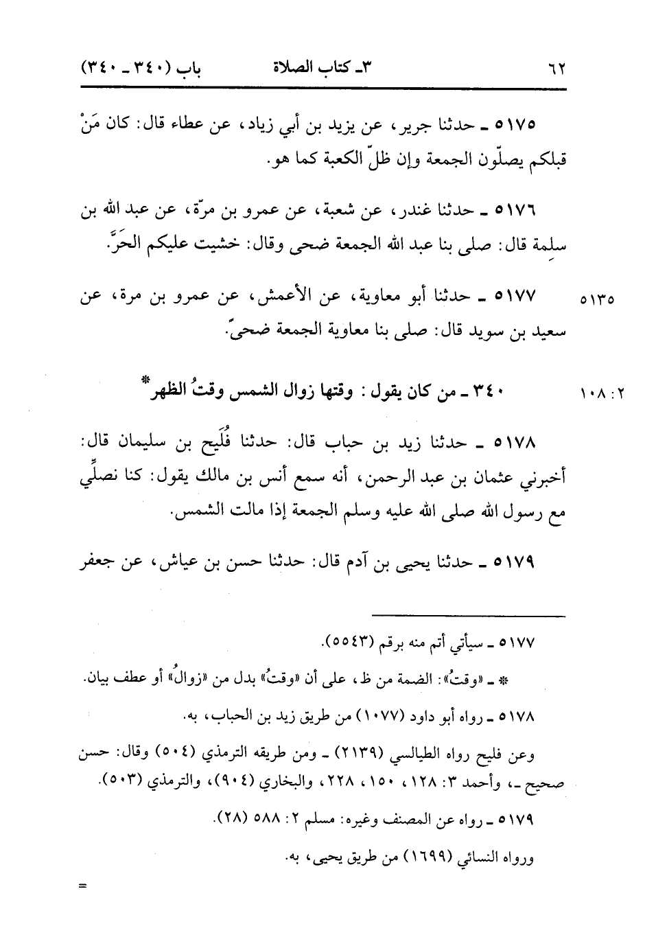5178- حَدَّثَنَا زَيْدُ بْنُ حُبَابٍ , قَالَ : حدَّثَنَا فُلَيْحُ بْنُ سُلَيْمَانَ ، قَالَ : أَخْبَرَنِي عُثْمَانُ بْنُ عَبْدِ الرَّحْمَنِ ؛ أَنَّهُ سَمِعَ أَنَسَ بْنَ مَالِكٍ ، يَقُولُ : كُنَّا نُصَلِّي مَعَ رَسُولِ اللهِ صَلَّى الله عَلَيْهِ وَسَلَّمَ الْجُمُعَةَ إِذَا مَالَتِ الشَّمْسُ.