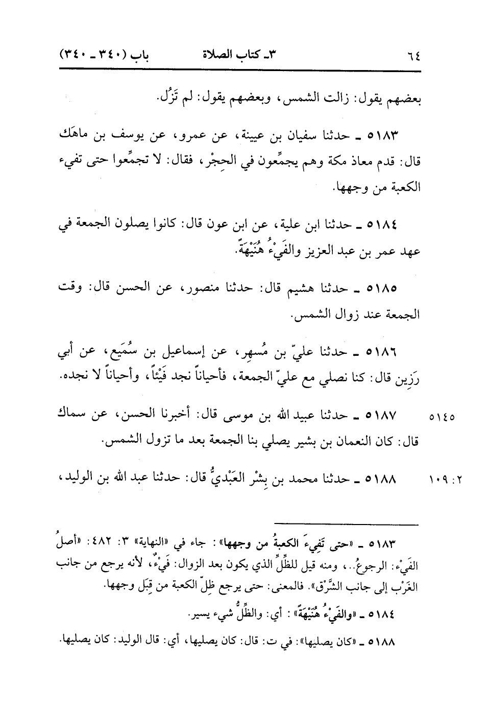 5184- حَدَّثَنَا ابْنُ عُلَيَّةَ ، عَنِ ابْنِ عَوْنٍ ، قَالَ : كَانُوا يُصَلُّونَ الْجُمُعَةَ فِي عَهْدِ عُمَرَ بْنِ عَبْدِ الْعَزِيزِ وَالْفَيْءُ هُنَيْهَةٌ.