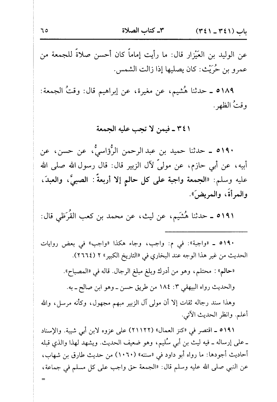 5190- حَدَّثَنَا حُمَيْدُ بْنُ عَبْدِ الرَّحْمَنِ الرُّؤَاسِيُّ ، عَنِ حَسَنٍ ، عَنْ أَبِيهِ ، عَنْ أَبِي حَازِمٍ ، عَنْ مَوْلًى لآلِ الزُّبَيْرِ ، قَالَ : قَالَ : رَسُولُ اللهِ صَلَّى الله عَلَيْهِ وَسَلَّمَ : الْجُمُعَةُ وَاجِبَةٌ عَلَى كُلِّ حَالِمٍ ، إِلاَّ أَرْبَعَةً : الصَّبِيُّ ، وَالْعَبْدُ ، وَالْمَرْأَةُ ، وَالْمَرِيضُ.