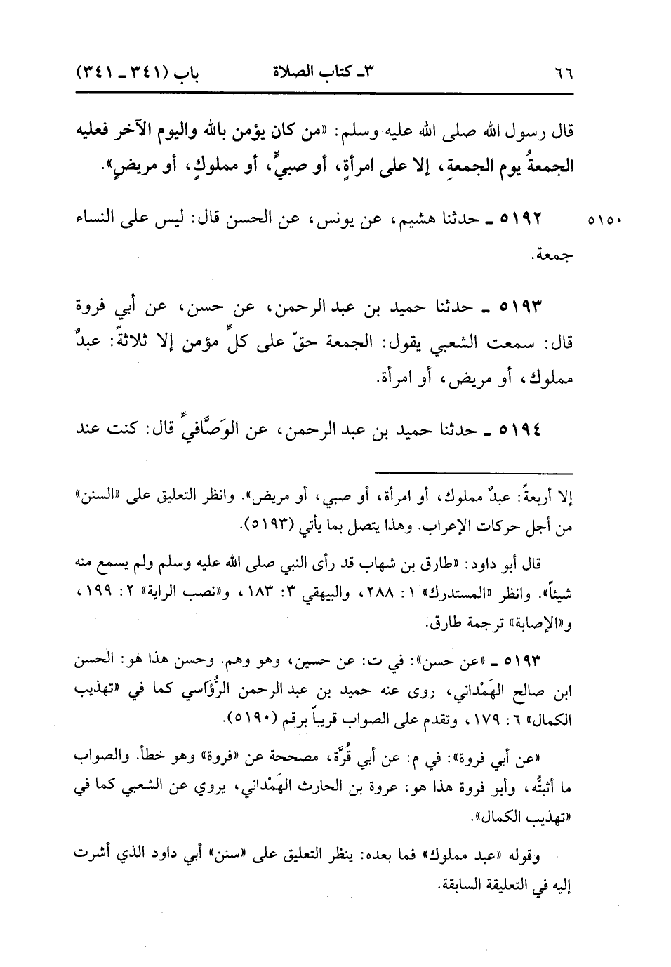 5193- حَدَّثَنَا حُمَيْدُ بْنُ عَبْدِ الرَّحْمَنِ ، عَنْ حَسَنٍ ، عَنْ أَبِي فَرْوَةَ ، قَالَ : سَمِعْتُ الشَّعْبِيُّ يَقُولُ : الْجُمُعَة حَقٌ عَلَى كُلِّ مُؤْمِنٍ ، إِلاَّ ثَلاَثَةٌ : عَبْدٌ مَمْلُوك ، أَوْ مَرِيضٌ ، أَوْ امْرَأَةٌ.