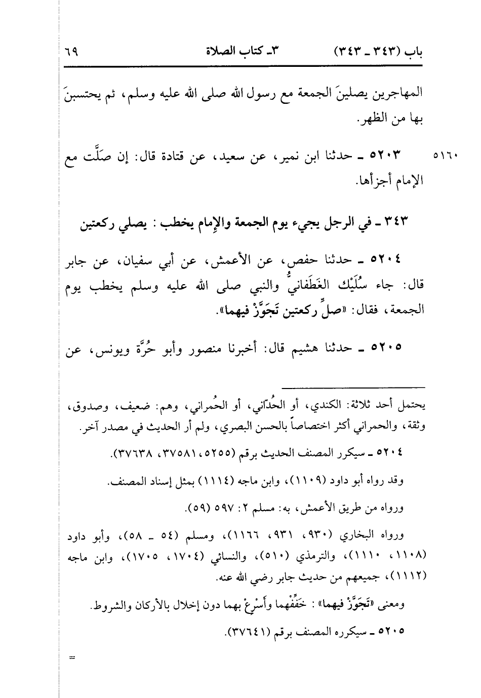 5205- حَدَّثَنَا هُشَيْمٌ , قَالَ : أَخْبَرَنَا مَنْصُورٌ ، وَأَبُو حُرَّةَ ، وَيُونُسَ ، عَنِ الْحَسَنِ ، قَالَ : جَاءَ سُلَيْكٌ الْغَطَفَانِيُّ وَالنَّبِيُّ صَلَّى الله عَلَيْهِ وَسَلَّمَ يَخْطُبُ يَوْمَ الْجُمُعَةِ ، وَلَمْ يَكُنْ صَلَّى الرَّكْعَتَيْنِ ، فَأَمَرَهُ النَّبِيُّ صَلَّى الله عَلَيْهِ وَسَلَّمَ أَنْ يُصَلِّيَ رَكْعَتَيْنِ يَتَجَوَّزُ فِيهِمَا. (2/110).