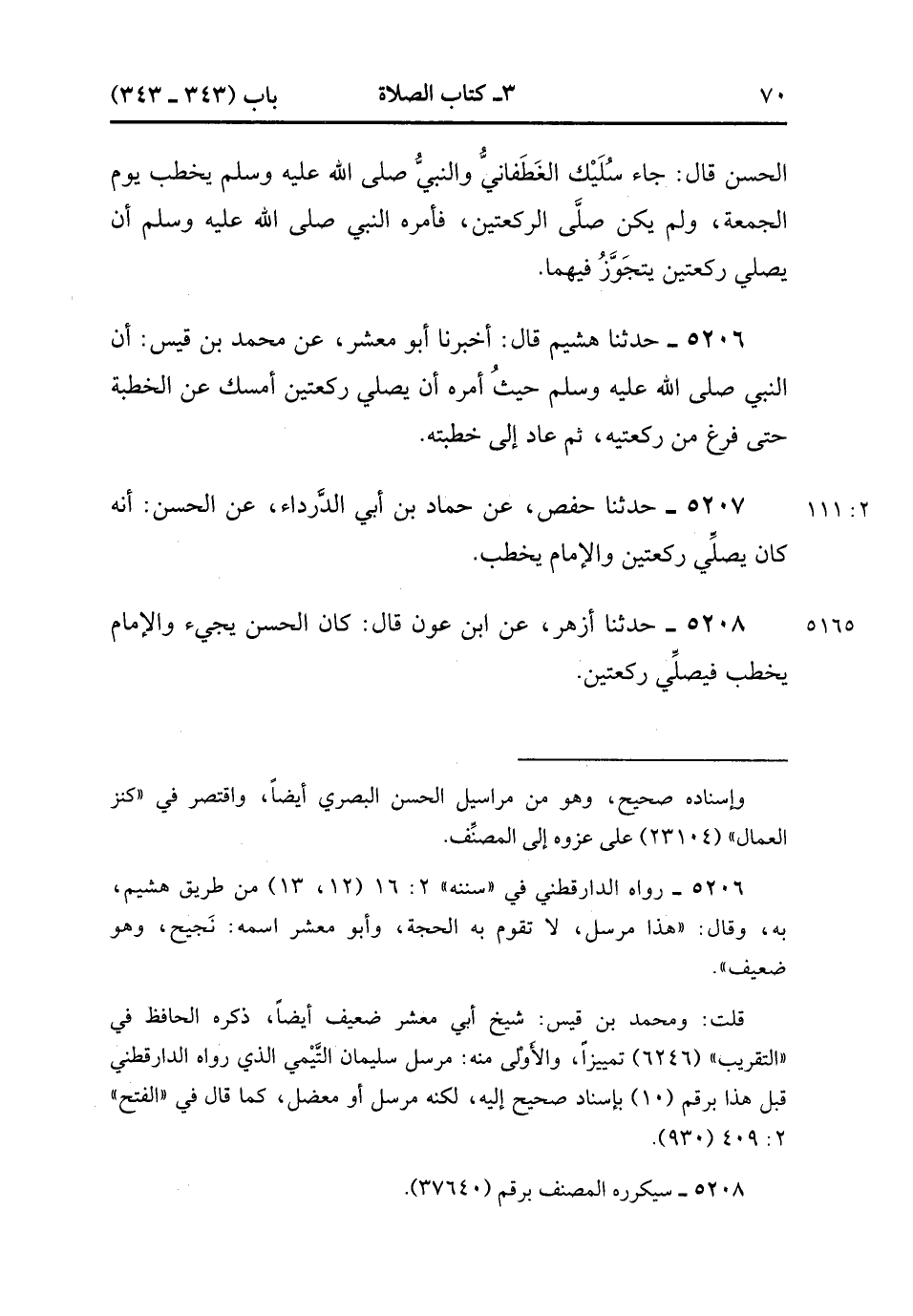 5208- حَدَّثَنَا أَزْهَرُ ، عَنِ ابْنِ عَوْنٍ ، قَالَ : كَانَ الْحَسَنُ يَجِيءُ وَالإِمَام يَخْطُبُ فَيُصَلِّي رَكْعَتَيْنِ. (2/111).