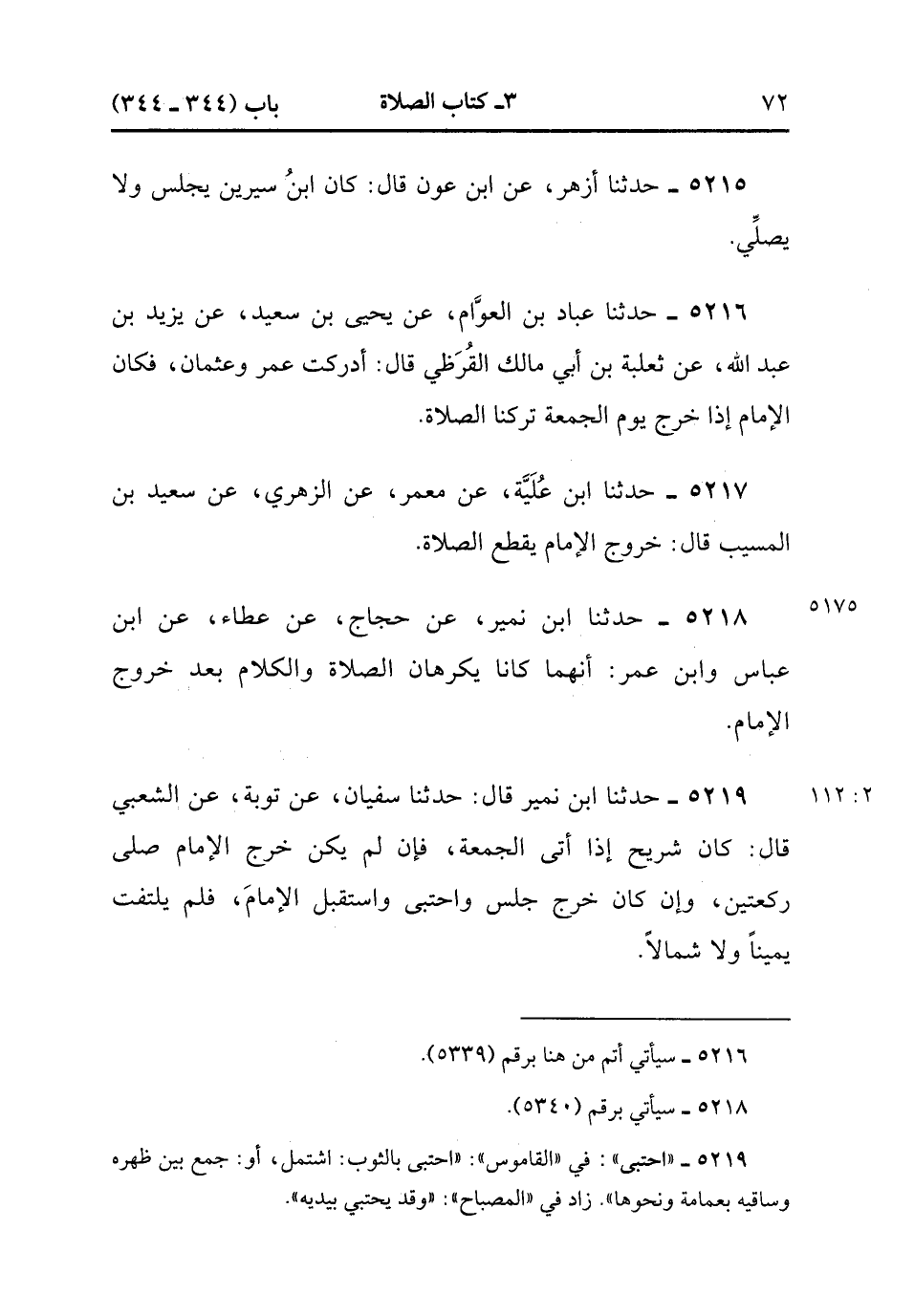 5219- حَدَّثَنَا ابْنُ نُمَيْرٍ , قَالَ : حدَّثَنَا سُفْيَانُ ، عَنْ تَوْبَةَ ، عَنِ الشَّعْبِيِّ ، قَالَ : كَانَ شُرَيْحٍ إِذَا أَتَى الْجُمُعَةَ ، فَإِنْ لَمْ يَكُنْ خَرَجَ الإِمَامُ صَلَّى رَكْعَتَيْنِ ، وَإِنْ كَانَ خَرَجَ جَلَسَ وَاحْتَبَى ، وَاسْتَقْبَلَ الإِمَام ، فَلَمْ يَلْتَفِتْ يَمِينًا ، وَلاَ شِمَالاً. (2/111).