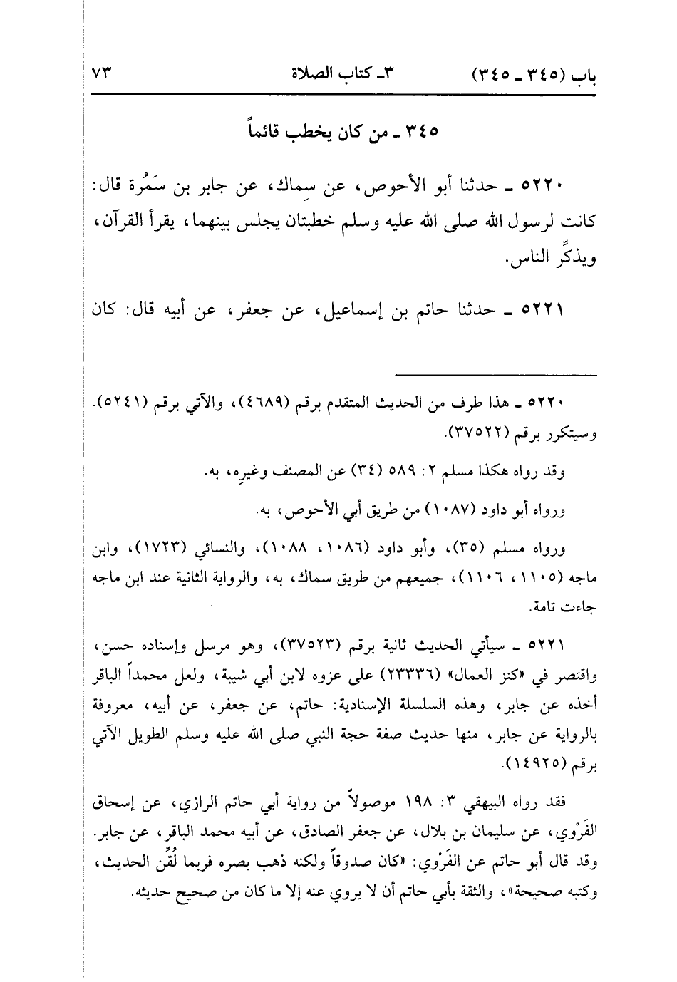 5221- حَدَّثَنَا حَاتِمُ بْنُ إِسْمَاعِيلَ ، عَنْ جَعْفَرٍ ، عَنْ أَبِيهِ ، قَالَ : كَانَ رَسُولُ اللهِ صَلَّى الله عَلَيْهِ وَسَلَّمَ يَخْطُبُ قَائِمًا ، ثُمَّ يَجْلِسُ ، ثُمَّ يَقُومُ ، يَخْطُبُ خُطْبَتَيْنِ. (2/112).