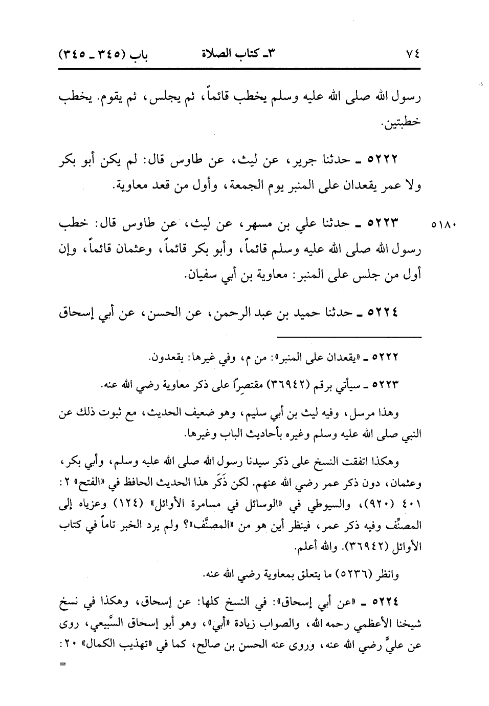 (1) في طبعة الرشد زاد : "وَعُمَرُ قَائِمًا" ، ولم يرد ذلك في طبعة عوامة ، وفي الهندية وضعها بين قوسين. (2/112)