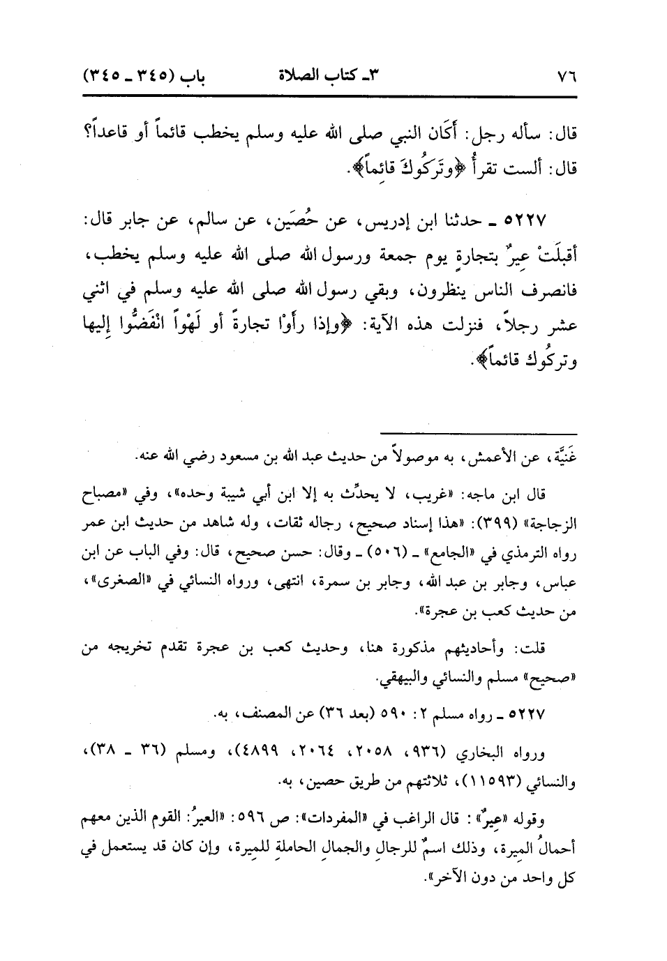 5227- حَدَّثَنَا ابْنُ إِدْرِيسَ ، عَنْ حُصَيْنٍ ، عَنْ سَالِمٍ ، عَنْ جَابِرٍ ، قَالَ : أَقْبَلَتْ عِيرٌ بِتِجَارَةٍ يَوْمَ جُمُعَةِ ، وَرَسُولُ اللهِ صَلَّى الله عَلَيْهِ وَسَلَّمَ يَخْطُبُ ، فَانْصَرَفَ النَّاسُ يَنْظُرُونَ ، وَبَقِيَ رَسُولُ اللهِ فِي اثْنَيْ عَشَرَ رَجُلاً ، فَنَزَلَتْ هَذِهِ الأَيَةُ : {وَإِذَا رَأَوْا تِجَارَةً ، أَوْ لَهْوًا انْفَضُّوا إِلَيْهَا ، وَتَرَكُوكَ قَائِمًا}. (2/113).