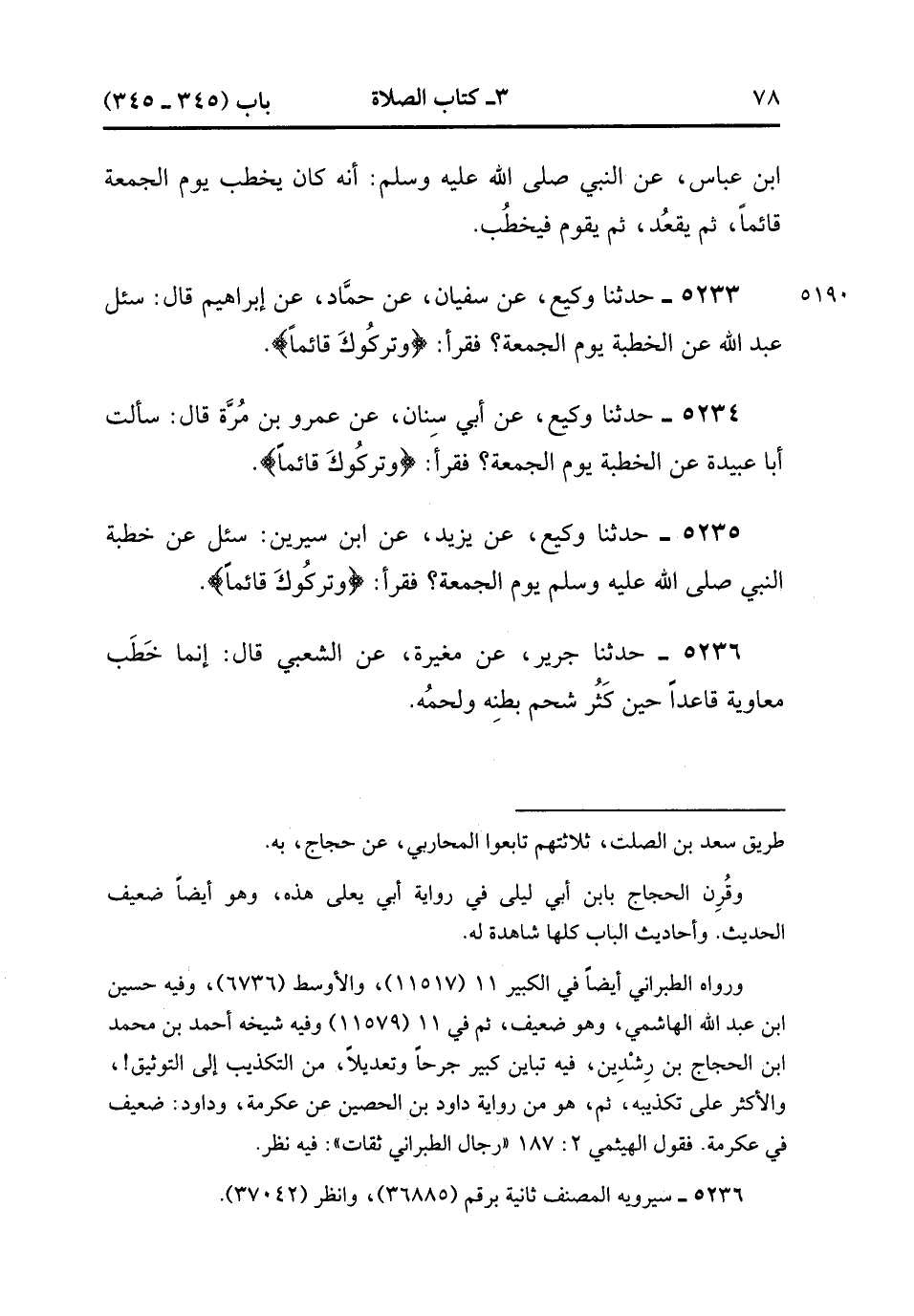 5236- حَدَّثَنَا جَرِيرٌ ، عَنْ مُغِيرَةَ ، عَنِ الشَّعْبِيِّ ، قَالَ : إِنَّمَا خَطَبَ مُعَاوِيَةُ قَاعِدًا ، حِيْنَ كَثُرَ شَحْمُ بَطْنِهِ وَلَحْمُهُ. (2/113).