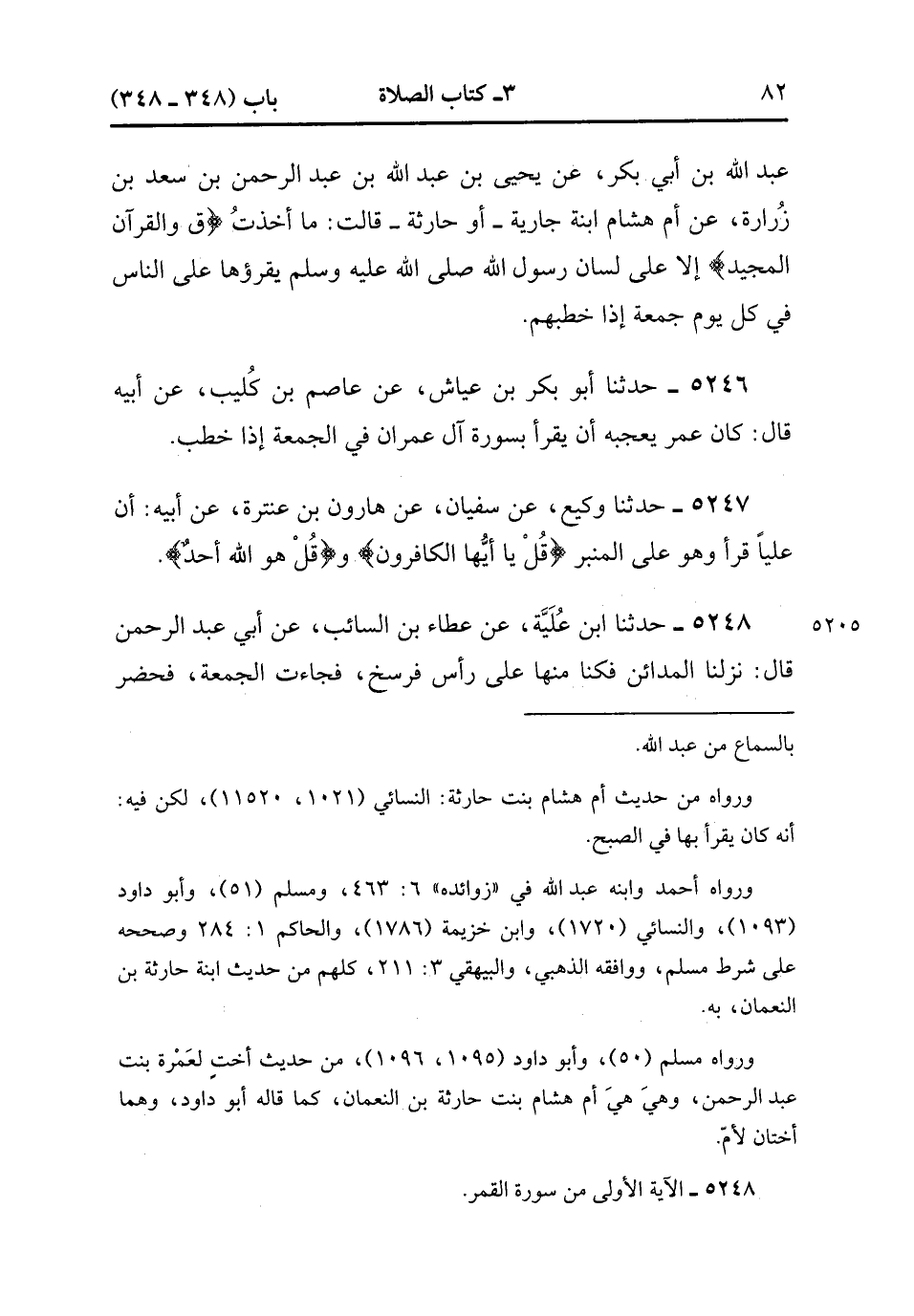 5248- حَدَّثَنَا ابْنُ عُلَيَّةَ ، عَنْ عَطَاءِ بْنِ السَّائِبِ ، عَنْ أَبِي عَبْدِ الرَّحْمَنِ ، قَالَ : نَزَلْنَا الْمَدَائِنَ ، فَكُنَّا مِنْهَا عَلَى رَأْسِ فَرْسَخٍ ، فَجَاءَتِ الْجُمُعَةُ ، فَحَضَرَ أَبِي وَحَضَرْتُ مَعَهُ ، فَخَطَبَنَا حُذَيْفَةُ ، فَقَالَ : إِنَّ اللَّهَ تَبَارَكَ وَتَعَالَى يَقُولُ : {اقْتَرَبَتِ السَّاعَةُ وَانْشَقَّ الْقَمَرُ}. (2/115).