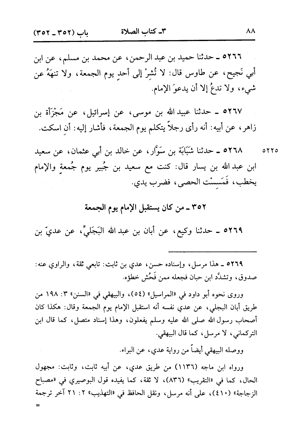 5269- حَدَّثَنَا وَكِيعٌ ، عَنْ أَبَانَ بْنِ عَبْدِ اللهِ الْبَجَلِيِّ ، عَنْ عَدِيِّ بْنِ ثَابِتٍ ، قَالَ : كَانَ النَّبِيُّ صَلَّى الله عَلَيْهِ وَسَلَّمَ إِذَا خَطَبَ اسْتَقْبَلَهُ أَصْحَابُهُ بِوُجُوهِهِمْ. (2/117).