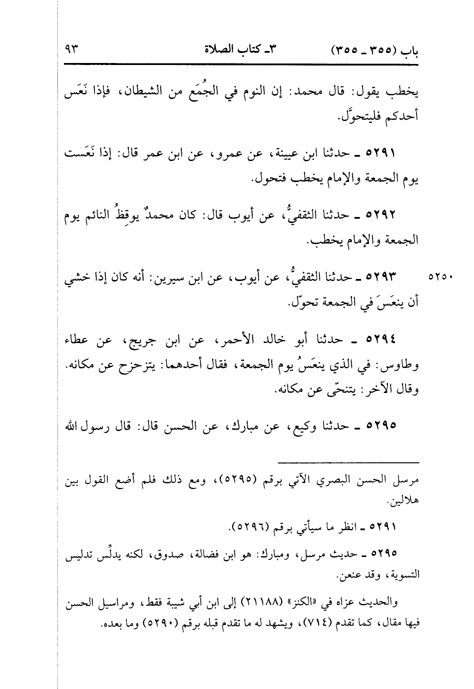 5295- حَدَّثَنَا وَكِيعٌ ، عَنْ مُبَارَكٍ ، عَنِ الْحَسَنِ ، قَالَ : قَالَ رَسُولُ اللهِ صَلَّى الله عَلَيْهِ وَسَلَّمَ : النَّوْمُ ، أَوِ النُّعَاسُ فِي الْجُمُعَةِ مِنَ الشَّيْطَانِ ، فَإِذَا نَعَسَ أَحَدُكُمْ فَلْيَتَحَوَّلْ. (2/119).