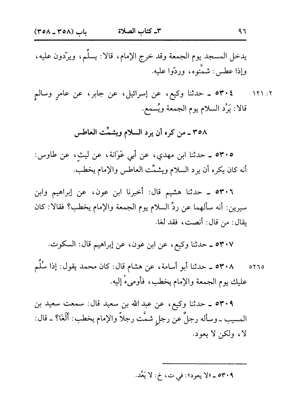 5309- حَدَّثَنَا وَكِيعٌ ، عَنْ عَبْدِ اللهِ بْنِ سَعِيدٍ ، قَالَ : سَمِعْتُ سَعِيدَ بْنَ الْمُسَيَّبِ ، وَسَأَلَهُ رَجُلٌ عَنْ رَجُلٍ شَمَّتَ رَجُلاً وَالإِمَام يَخْطُبُ ، أَلَغَا ؟ قَالَ : لاَ ، وَلَكِنْ لاَ يَعُودُ. (2/121).