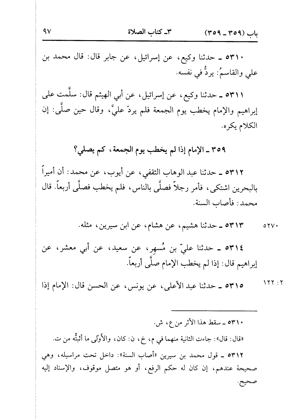 5312- حَدَّثَنَا عَبْدُ الْوَهَّابِ الثَّقَفِيُّ ، عَنْ أَيُّوبَ ، عَنْ مُحَمَّدٍ ؛ أَنَّ أَمِيرًا بِالْبَحْرَيْنِ أشْتَكَى ، فَأَمَرَ رَجُلاً فَصَلَّى بِالنَّاسِ ، فَلَمْ يَخْطُبْ فَصَلَّى أَرْبَعًا ، قَالَ مُحَمَّدٌ : فَأَصَابَ السُّنَّةَ.