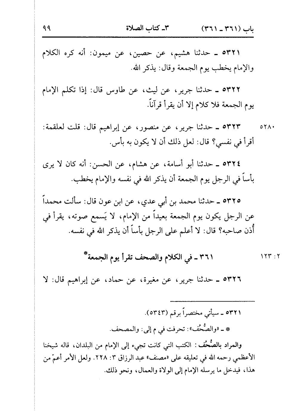 5326- حَدَّثَنَا جَرِيرٌ ، عَنْ مُغِيرَةَ ، عَنْ حَمَّادٍ ، عَنْ إِبْرَاهِيمَ ، قَالَ : لاَ بَأْسَ أَنْ يَقْرَأَ وَيَذْكُرَ اللَّهَ ، إِذَا قَرَؤُوا الصُّحُفَ يَوْمَ الْجُمُعَةِ. (2/123).