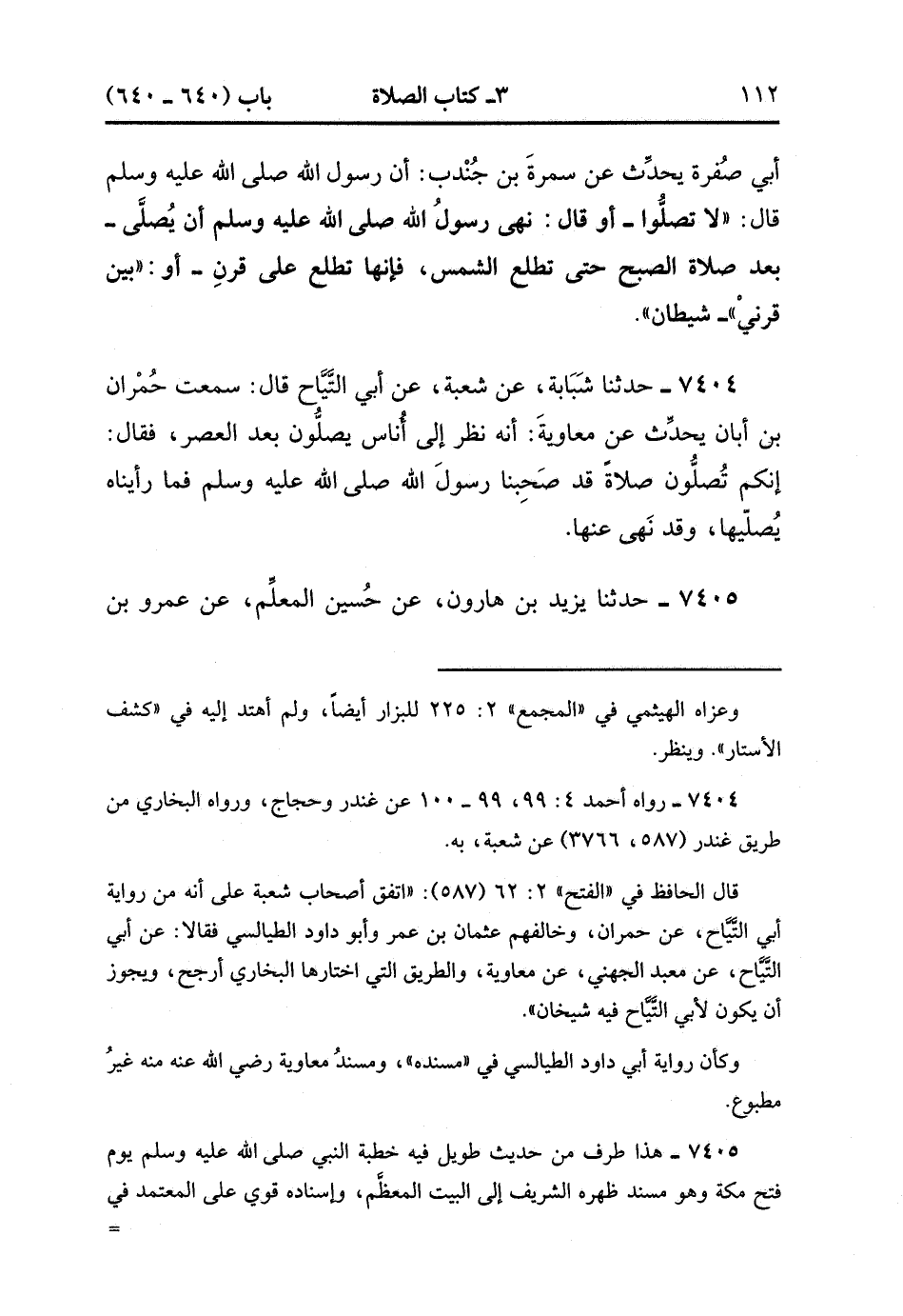 7405- حَدَّثَنَا يَزِيدُ بْنُ هَارُونَ ، عَنْ حُسَيْنٍ الْمُعَلِّمِ ، عَنْ عَمْرِو بْنِ شُعَيْبٍ ، عَنْ أَبِيهِ ، عَنْ جَدِّهِ ، أَنَّ النَّبِيَّ صَلَّى الله عَلَيْهِ وَسَلَّمَ نَهَى عَنْ صَلاَةٍ بَعْدَ الْعَصْرِ حَتَّى تَغْرُبَ الشَّمْسُ ، وَعَنْ صَلاَةٍ بَعْدَ الصُّبْحِ حَتَّى تَطْلُعَ الشَّمْسُ. (2/349).