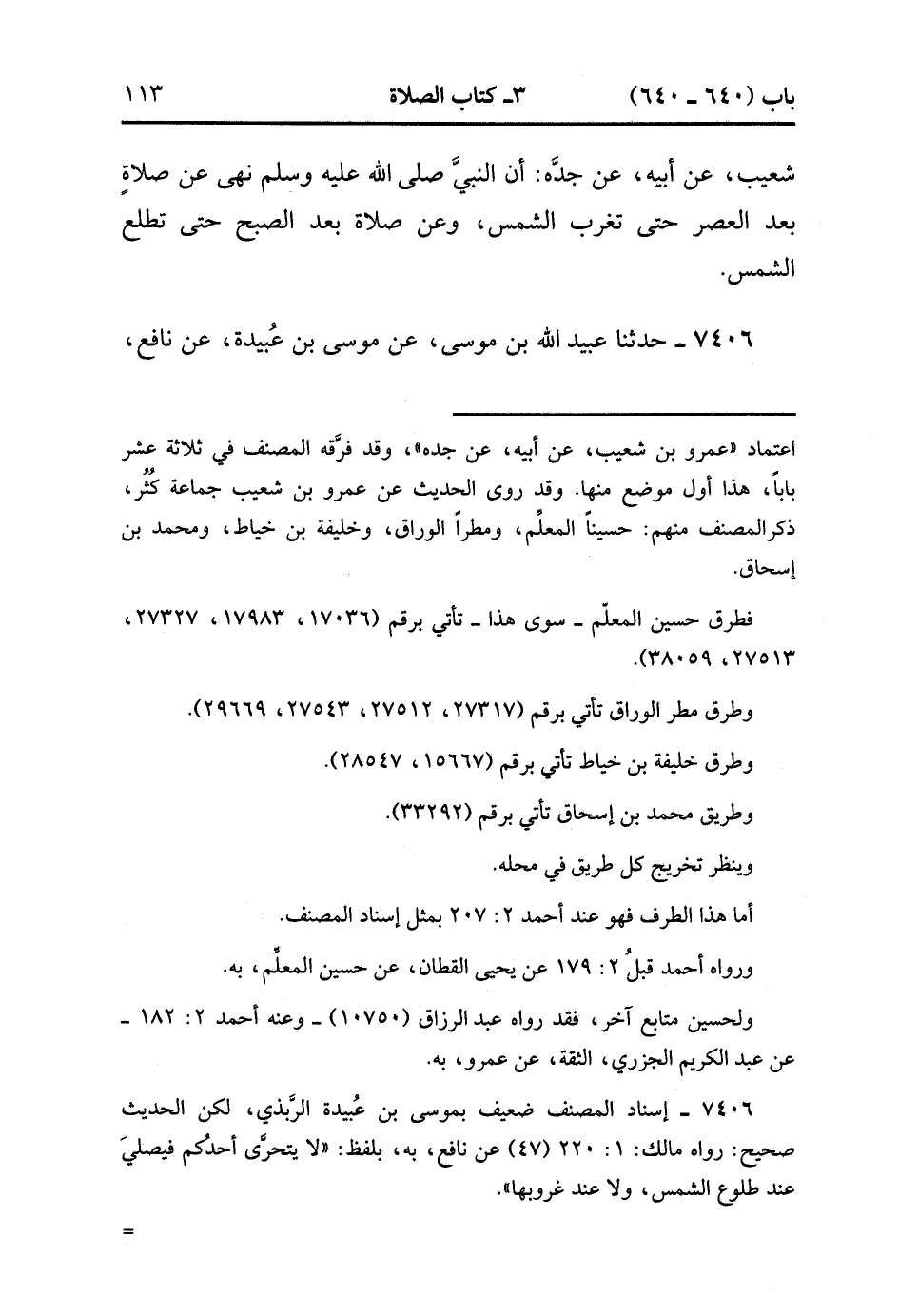 7406- حَدَّثَنَا عُبَيْدُ اللهِ بْنُ مُوسَى ، عَنْ مُوسَى بْنِ عُبَيْدَةَ ، عَنْ نَافِعٍ ، عَنِ ابْنِ عُمَرَ ، أَنَّ النَّبِيَّ صَلَّى الله عَلَيْهِ وَسَلَّمَ نَهَى عَنْ صَلاَتَيْنِ ، عَنْ صَلاَةٍ بَعْدَ الصُّبْحِ حَتَّى تَطْلُعَ الشَّمْسُ ، وَعَنْ صَلاَةٍ بَعْدَ الْعَصْرِ حَتَّى تَغْرُبَ الشَّمْسُ. (2/349).