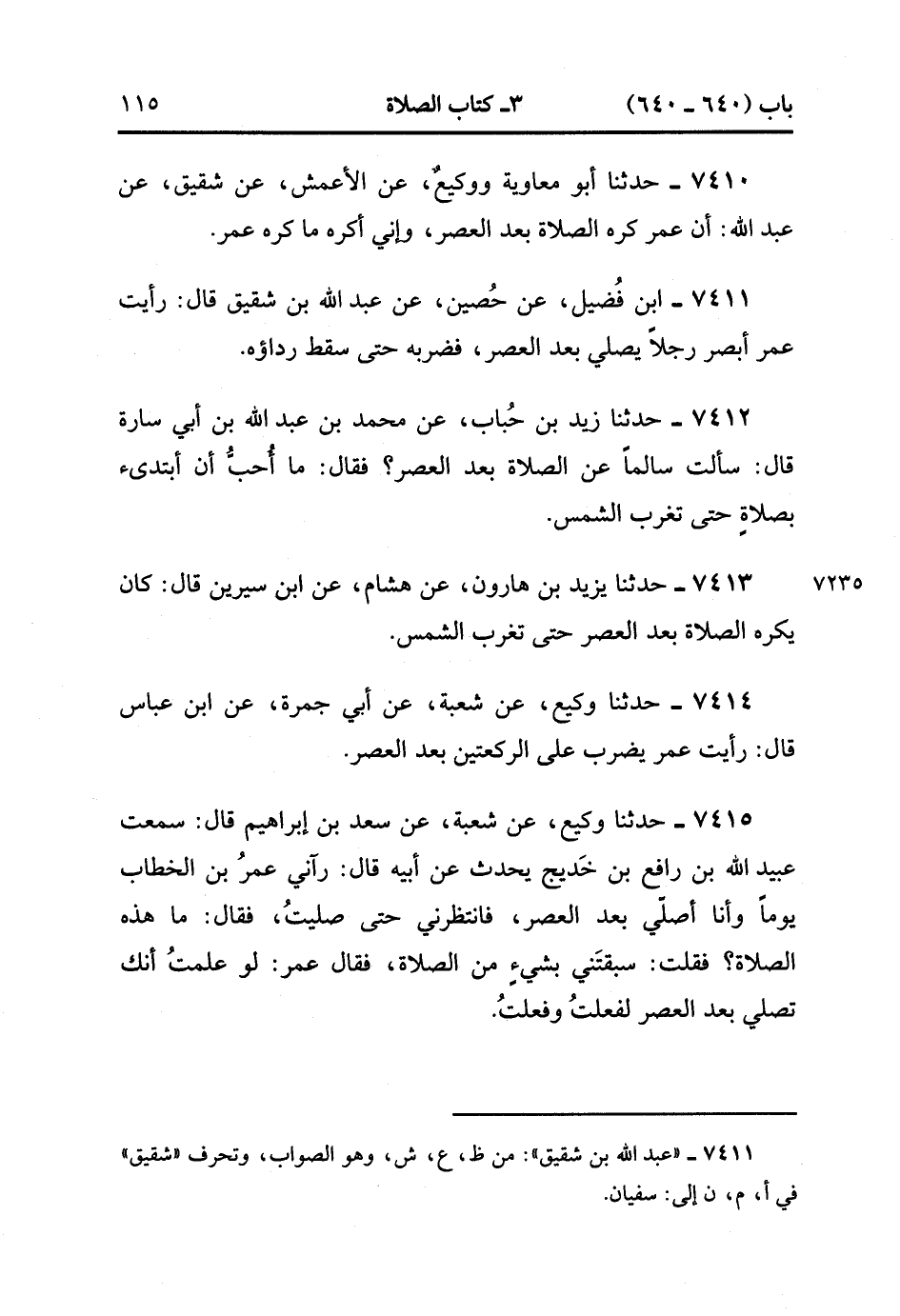 7411- حَدَّثَنَا ابْنُ فُضَيْلٍ ، عَنْ حُصَيْنٍ ، عَنْ عَبْدِ اللهِ بْنِ شَقِيقٍ ، قَالَ : رَأَيْتُ عُمَرَ أَبْصَرَ رَجُلاً يُصَلِّي بَعْدَ الْعَصْرِ فَضَرَبَهُ حَتَّى سَقَطَ رِدَاؤُهُ.