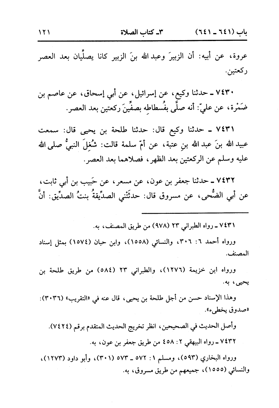 7432- حَدَّثَنَا جَعْفَرُ بْنُ عَوْنٍ ، عَنْ مِسْعَرٍ ، عَنْ حَبِيبِ بْنِ أَبِي ثَابِتٍ ، عَنْ أَبِي الضُّحَى ، عَنْ مَسْرُوقٍ ، قَالَ : حَدَّثَتْنِي الصِّدِّيقَةُ بِنْتُ الصِّدِّيقِ ، أَنَّ رَسُولَ اللهِ صَلَّى الله عَلَيْهِ وَسَلَّمَ مَا دَخَلَ عَلَيْهَا بَعْدَ الْعَصْرِ إِلاَّ صَلَّى رَكْعَتَيْنِ. (2/353).
