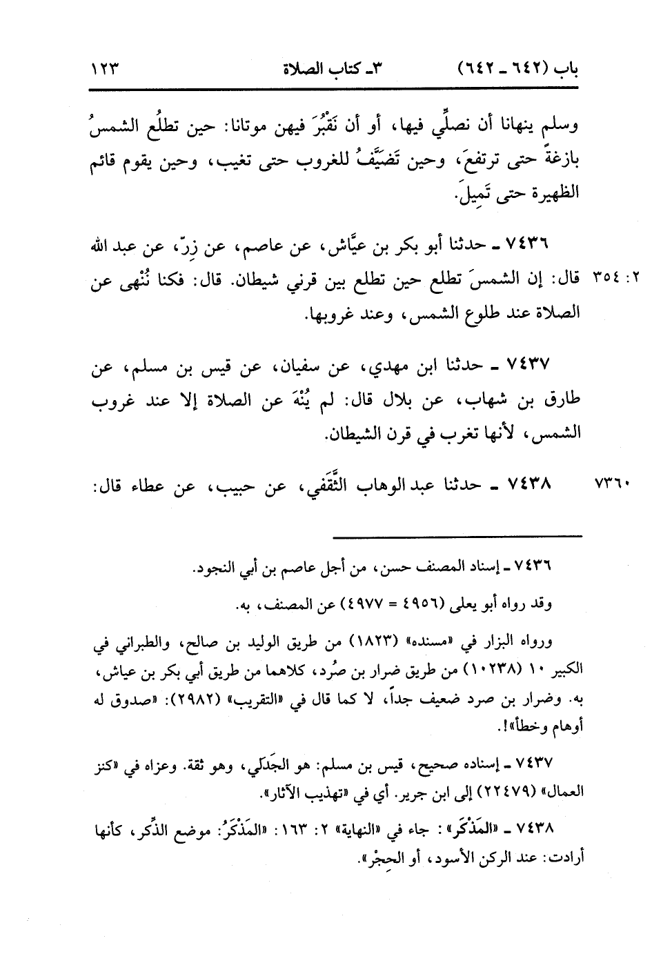 7436- حَدَّثَنَا أَبُو بَكْرِ بْنُ عَيَّاشٍ ، عَنْ عَاصِمٍ ، عَنْ زِرٍّ ، عَنْ عَبْدِ اللهِ ، قَالَ : إنَّ الشَّمْسَ تَطْلُعُ حِينَ تَطْلُعُ بَيْنَ قَرْنَيْ شَيْطَانٍ ، قَالَ : فَكُنَّا نُنْهَى ، عَنِ الصَّلاَة عِنْدَ طُلُوعِ الشَّمْسِ ، وَعِنْدَ غُرُوبِهَا. (2/353)
